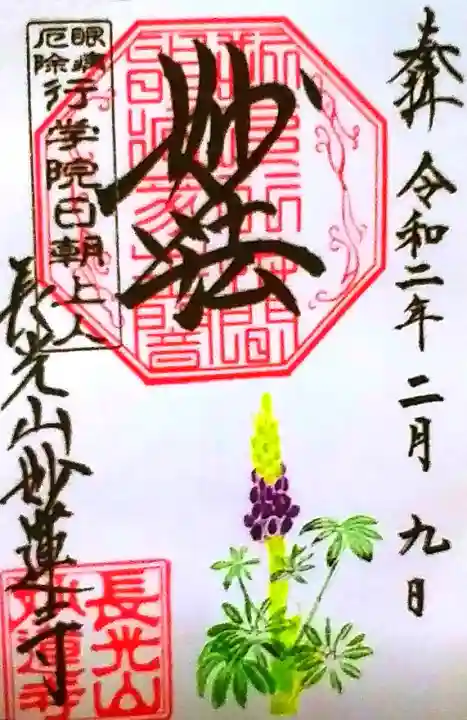 上部中央に妙法と書かれ、その下に印、左上に眼病厄除 行学院日朝上人の印、左下に長光山妙蓮寺の文字と長光山妙蓮寺の印、下部にルピナスが描かれています。