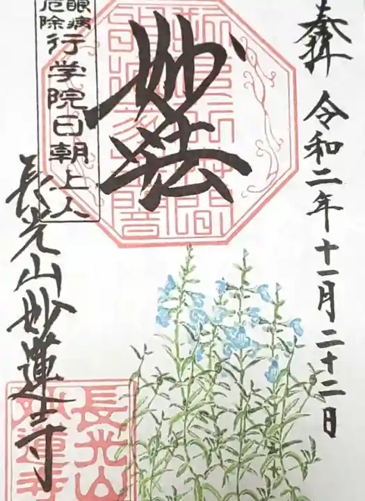 上部中央に妙法と書かれ、その下に印、左上に眼病厄除 行学院日朝上人の印、左下に長光山妙蓮寺の文字と長光山妙蓮寺の印、下部にサルビア・アズレアが描かれています。