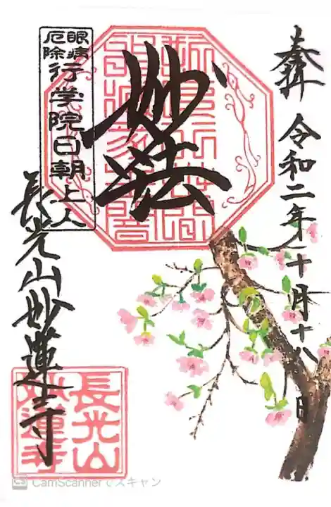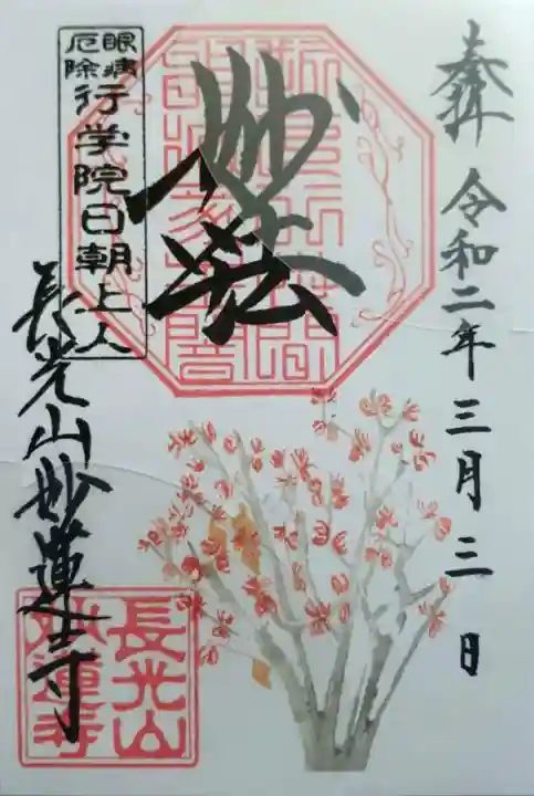 上部中央に妙法と書かれ、その下に印、左上に眼病厄除 行学院日朝上人の印、左下に長光山妙蓮寺の文字と長光山妙蓮寺の印、下部に白梅が描かれています。