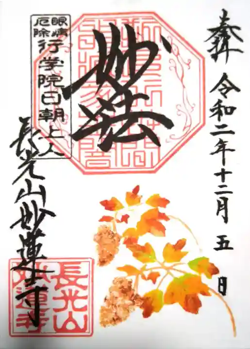 中央に妙法と書かれ、その下に印、左に眼病厄除 行学院日朝上人の印、左下に長光山妙蓮寺の文字、長光山妙蓮寺の印が押されています。