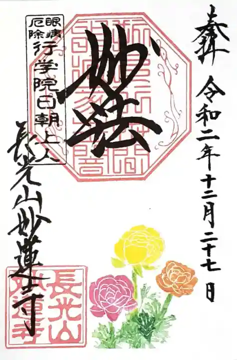 上部中央に妙法と書かれ、その下に印、左上に眼病厄除 行学院日朝上人の印、左下に長光山妙蓮寺の文字と長光山妙蓮寺の印、下部にラナンキュラスが描かれています。