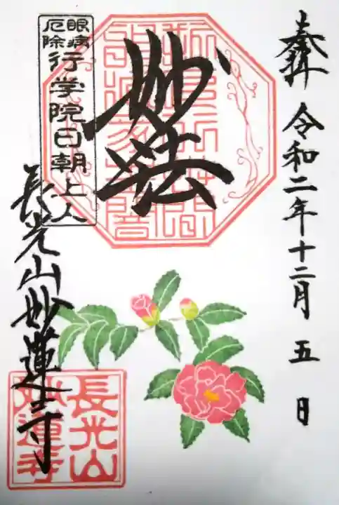 上部中央に妙法と書かれ、その下に印、左上に眼病厄除 行学院日朝上人の印、左下に長光山妙蓮寺の文字と長光山妙蓮寺の印、下部に寒椿が描かれています。