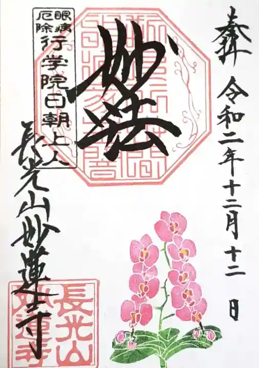 上部中央に妙法と書かれ、その下に印、左上に眼病厄除 行学院日朝上人の印、左下に長光山妙蓮寺の文字と長光山妙蓮寺の印、下部に胡蝶蘭が描かれています。