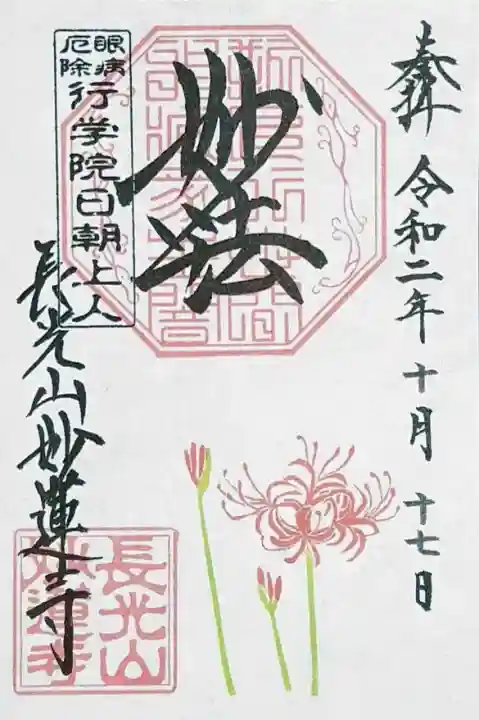 上部中央に妙法と書かれ、その下に印、左上に眼病厄除 行学院日朝上人の印、左下に長光山妙蓮寺の文字と長光山妙蓮寺の印、下部にヒガンバナが描かれています。