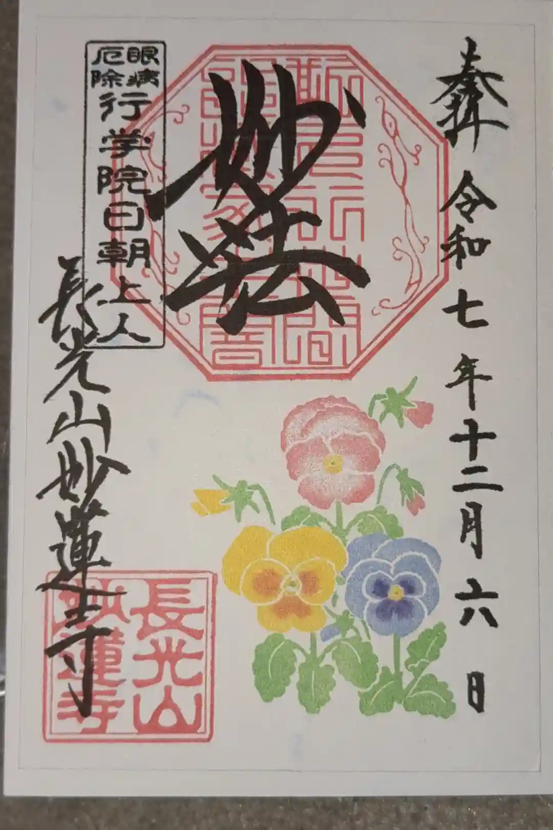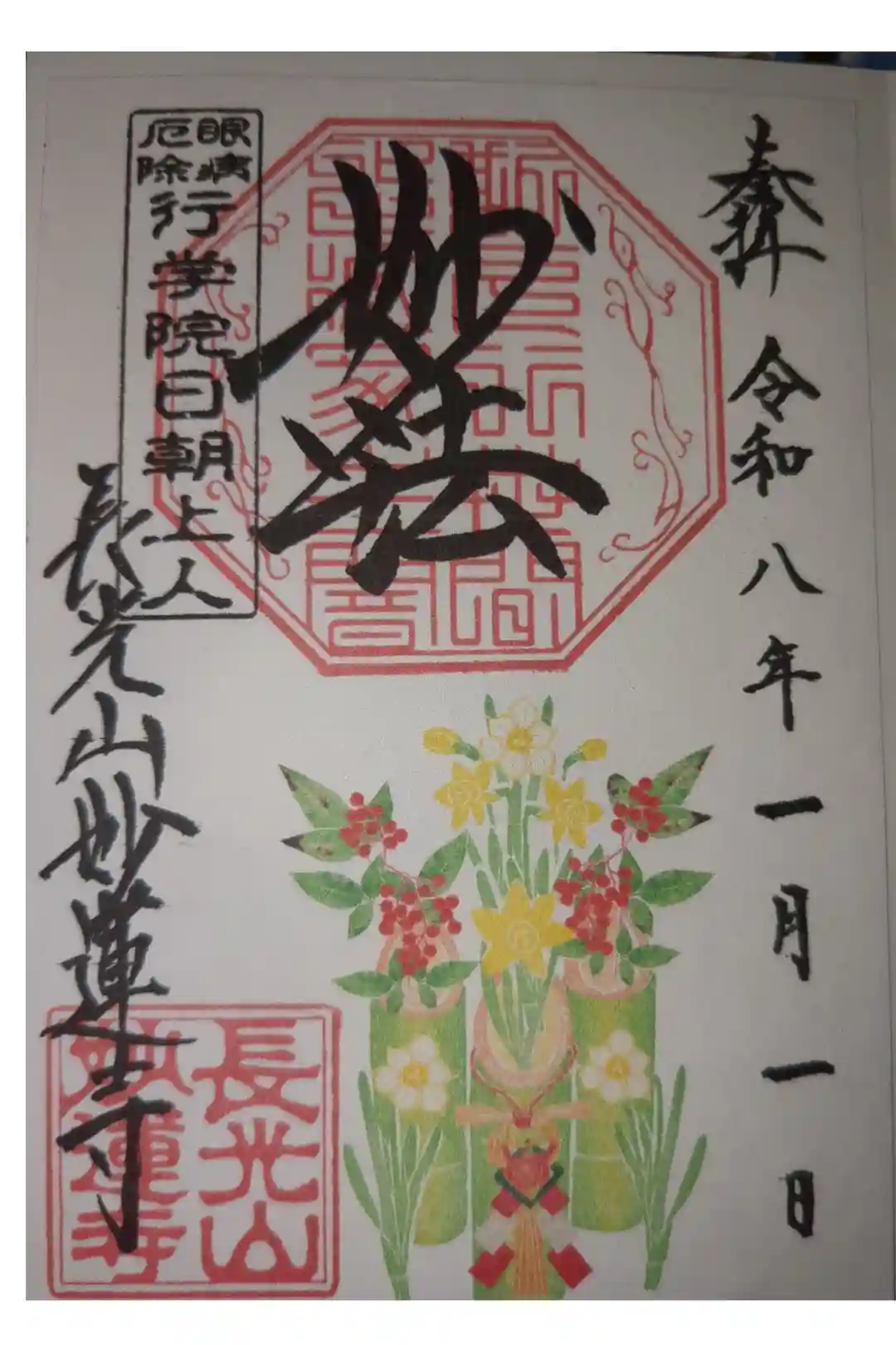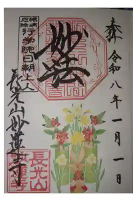 上部中央に妙法と書かれ、その下に印、左上に眼病厄除 行学院日朝上人の印、左下に長光山妙蓮寺の文字と長光山妙蓮寺の印、下部にラナンキュラスが描かれています。