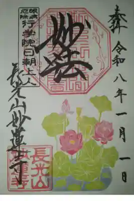 上部中央に妙法と書かれ、その下に印、左上に眼病厄除 行学院日朝上人の印、左下に長光山妙蓮寺の文字と長光山妙蓮寺の印、下部にハスが描かれています。