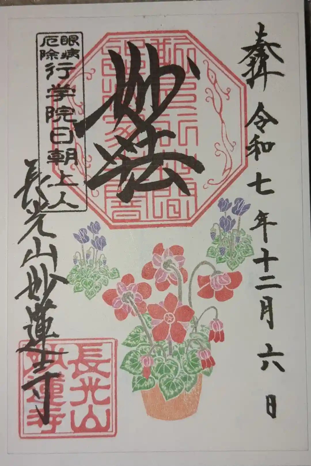 上部中央に妙法と書かれ、その下に印、左上に眼病厄除 行学院日朝上人の印、左下に長光山妙蓮寺の文字と長光山妙蓮寺の印、下部にシクラメンが描かれています。