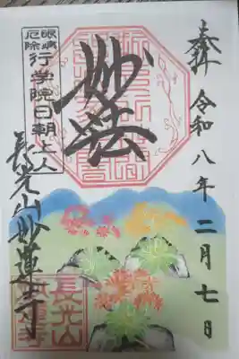 中央に妙法と書かれ、その下に印、左に眼病厄除 行学院日朝上人の印、左下に長光山妙蓮寺の文字、長光山妙蓮寺の印が押されています。