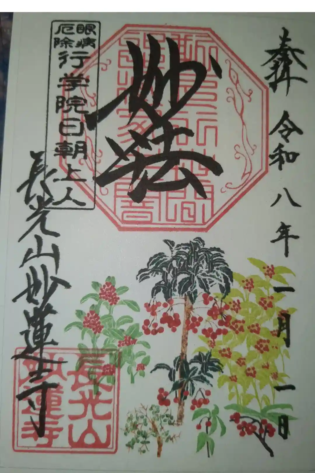 上部中央に妙法と書かれ、その下に印、左上に眼病厄除 行学院日朝上人の印、左下に長光山妙蓮寺の文字と長光山妙蓮寺の印、下部にアロニアが描かれています。