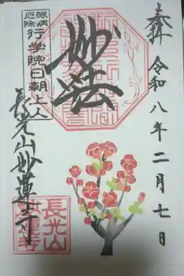 上部中央に妙法と書かれ、その下に印、左上に眼病厄除 行学院日朝上人の印、左下に長光山妙蓮寺の文字と長光山妙蓮寺の印、下部に白梅が描かれています。