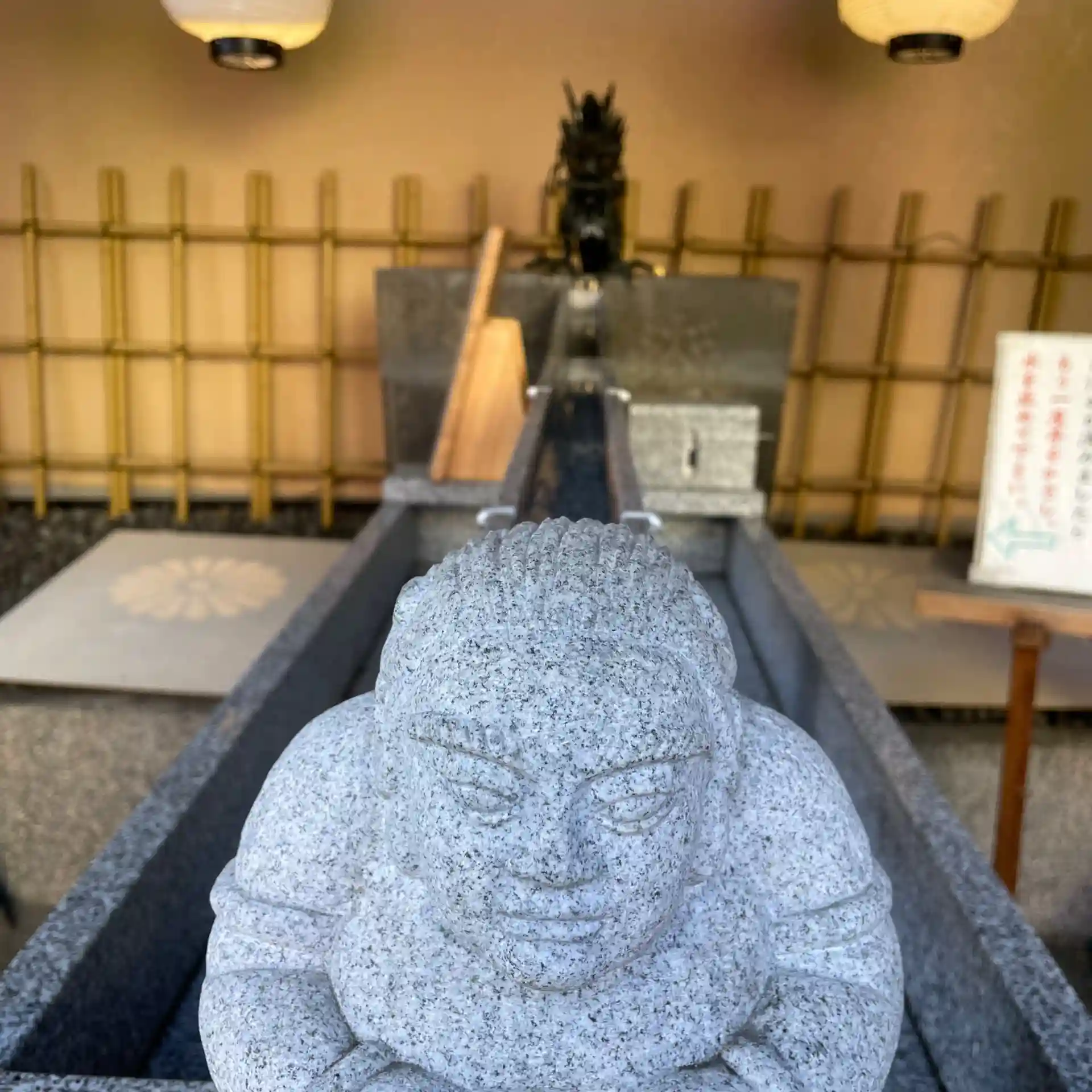境内に童謡が流れ、なんだか懐かしい気分になりました。手水舎の柱を支える鬼「がまんさま」がいます。