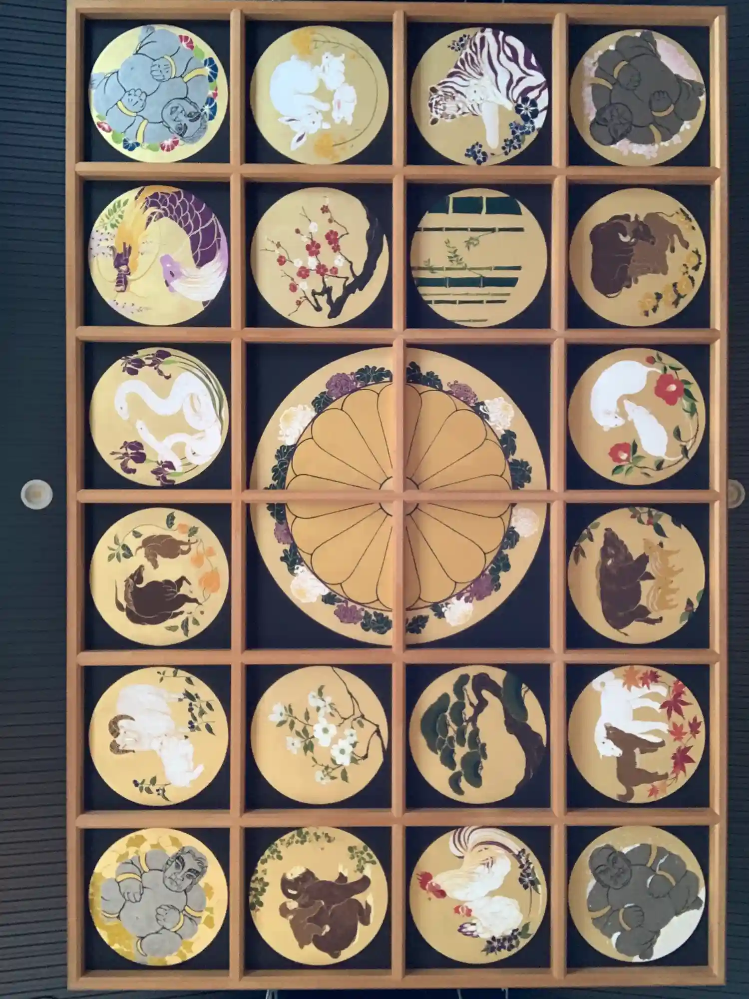 菊の花を中心に配し、四方にはがまんさまによって守られる24枚の天井画です。