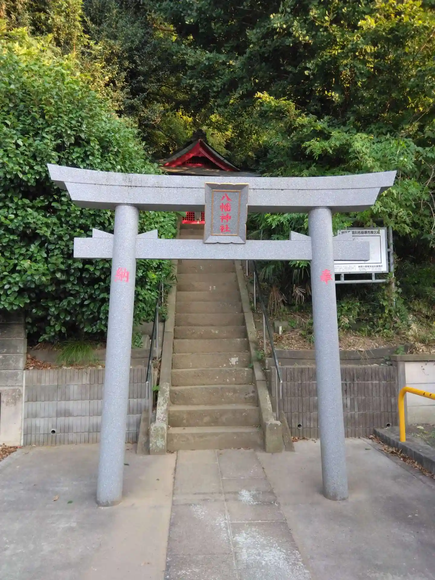 住宅地の丘にたたずむ小さな赤い社です。