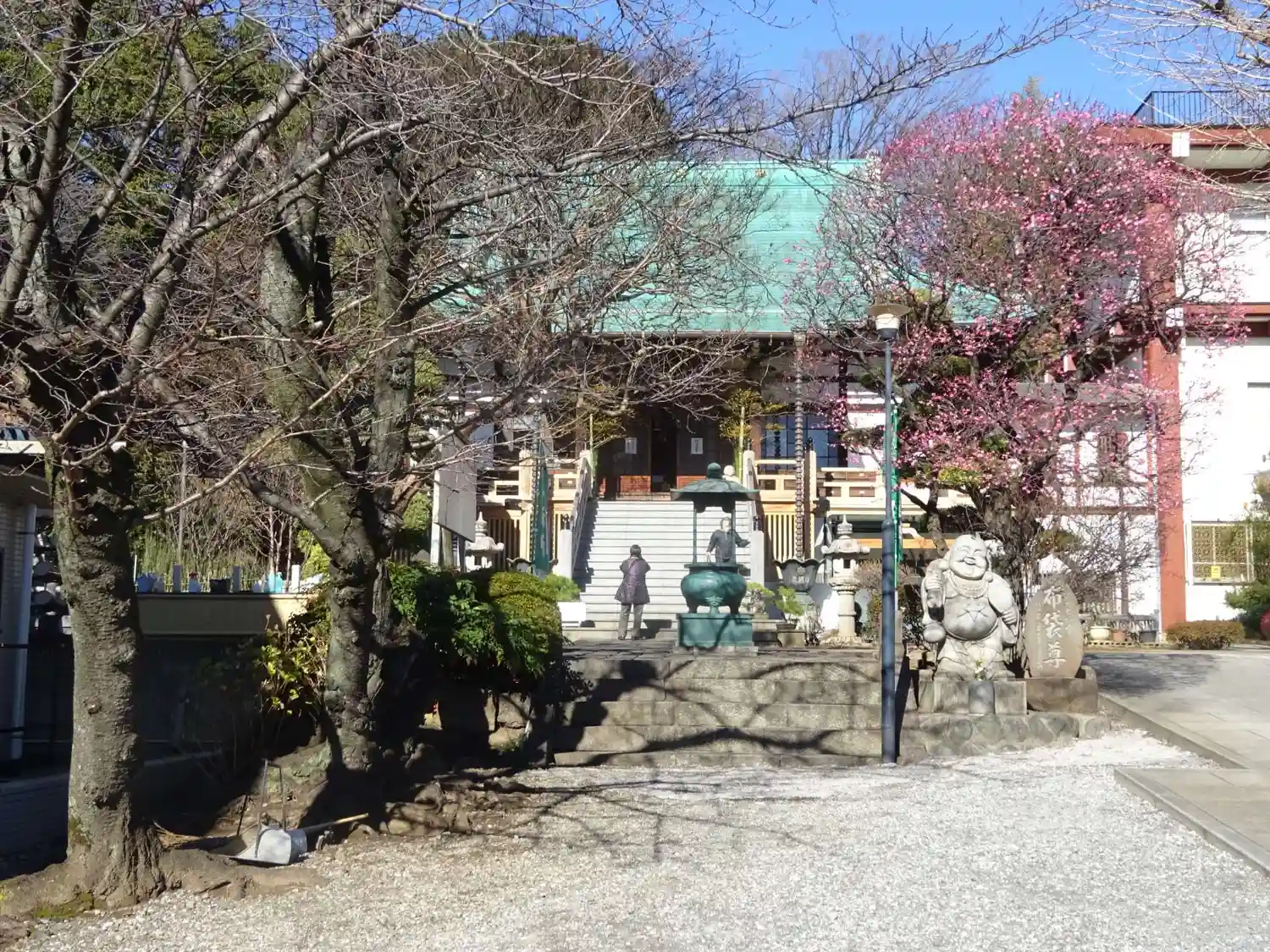 賑やかな綱島の繁華街を抜けた先に佇む、曹洞宗の寺院、東照寺へ参拝しました。参道では、朗らかな表情の等身大の布袋様が出迎えてくださり、心が和みました。境内の梅の木は、まだ寒さの残る季節にもかかわらず、可憐な花を咲かせ始めており、春の訪れを感じさせてくれました。