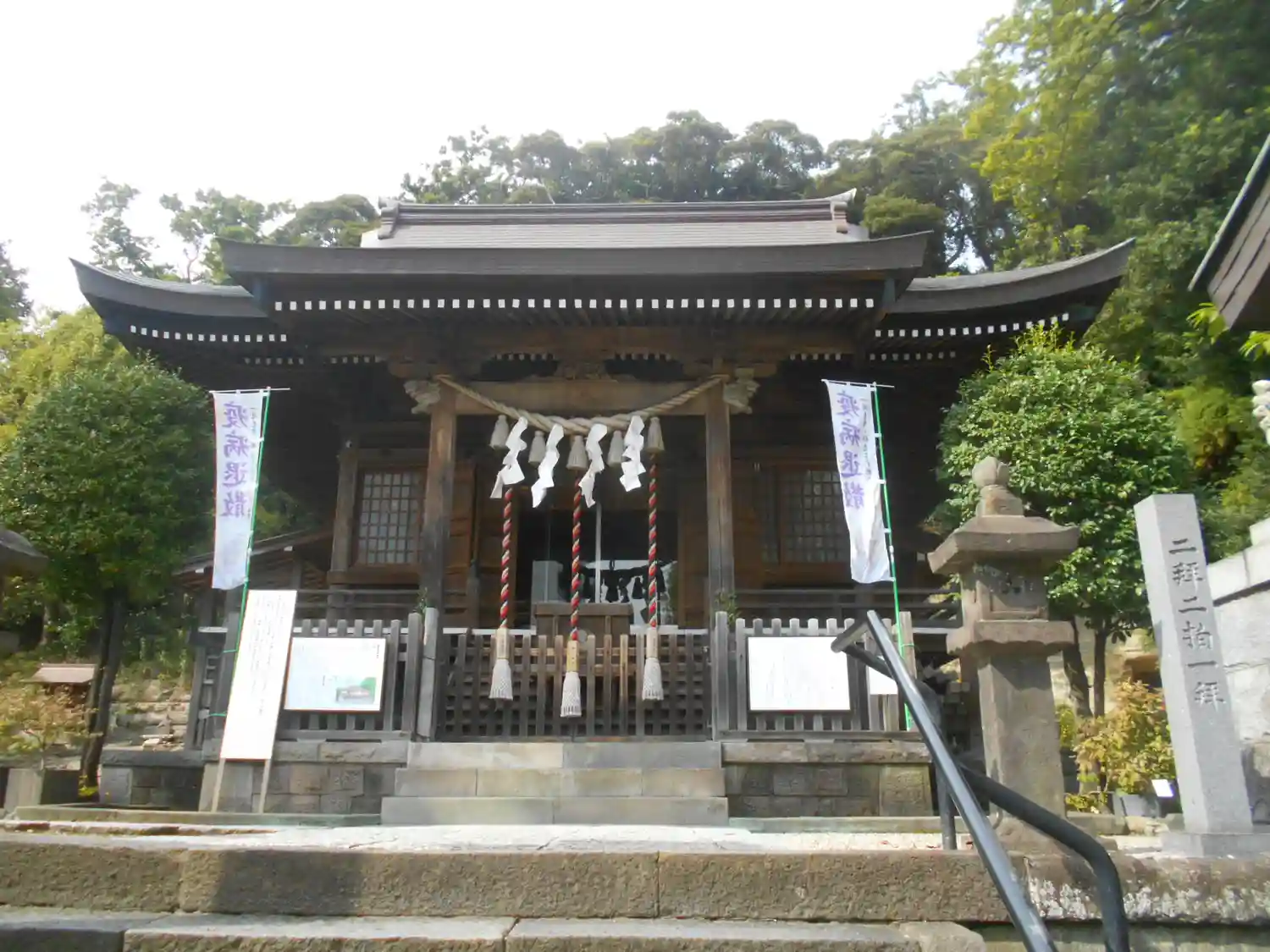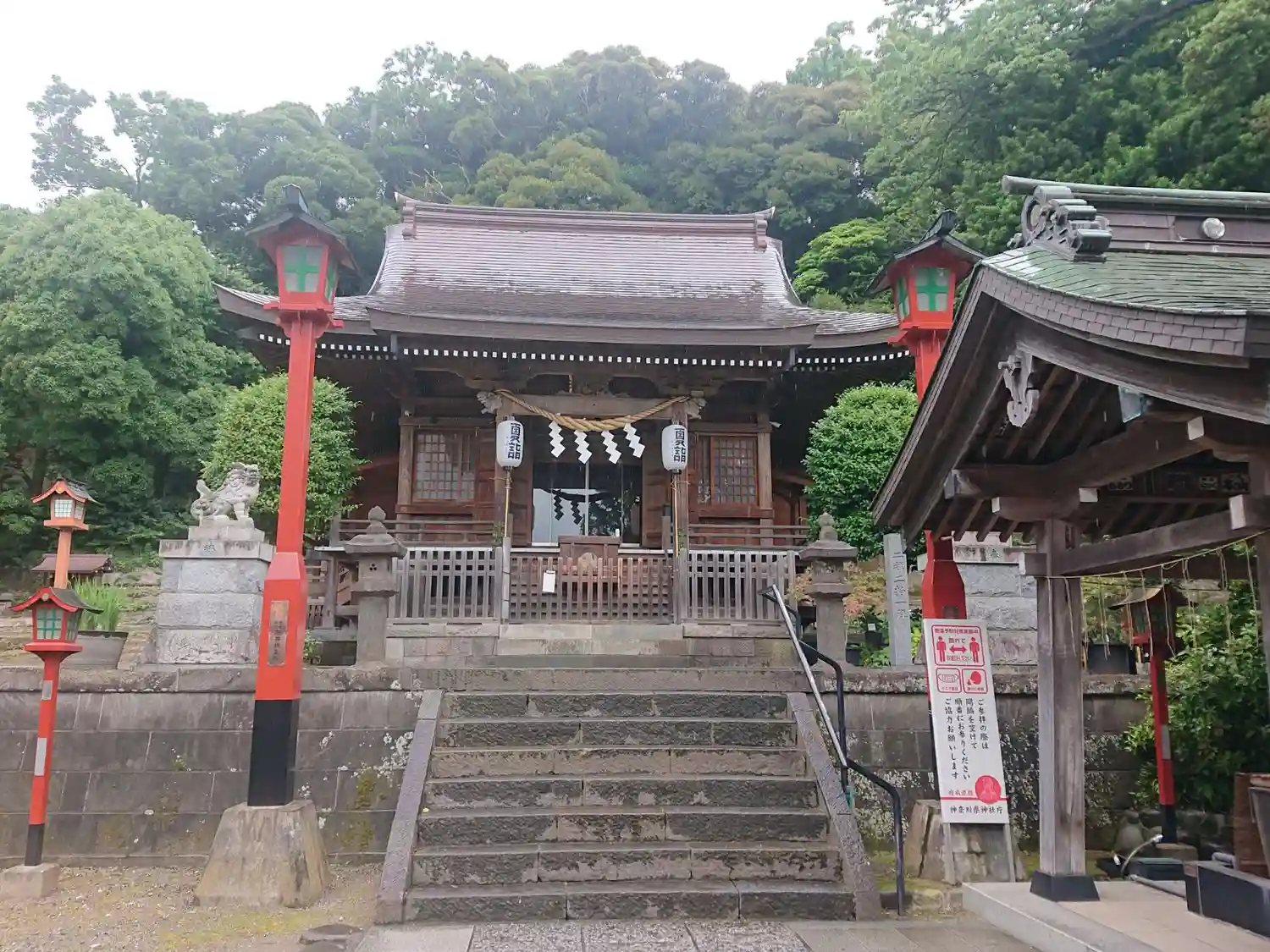 社殿前に疫病退散の幟があり