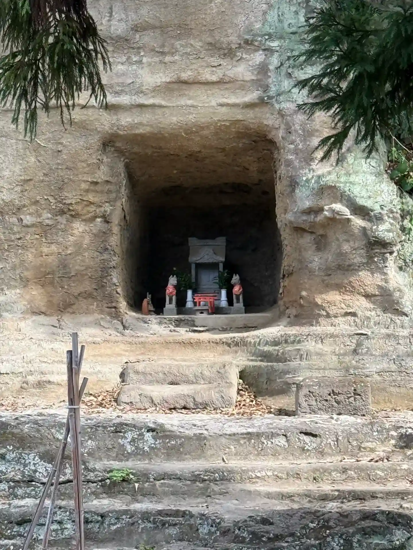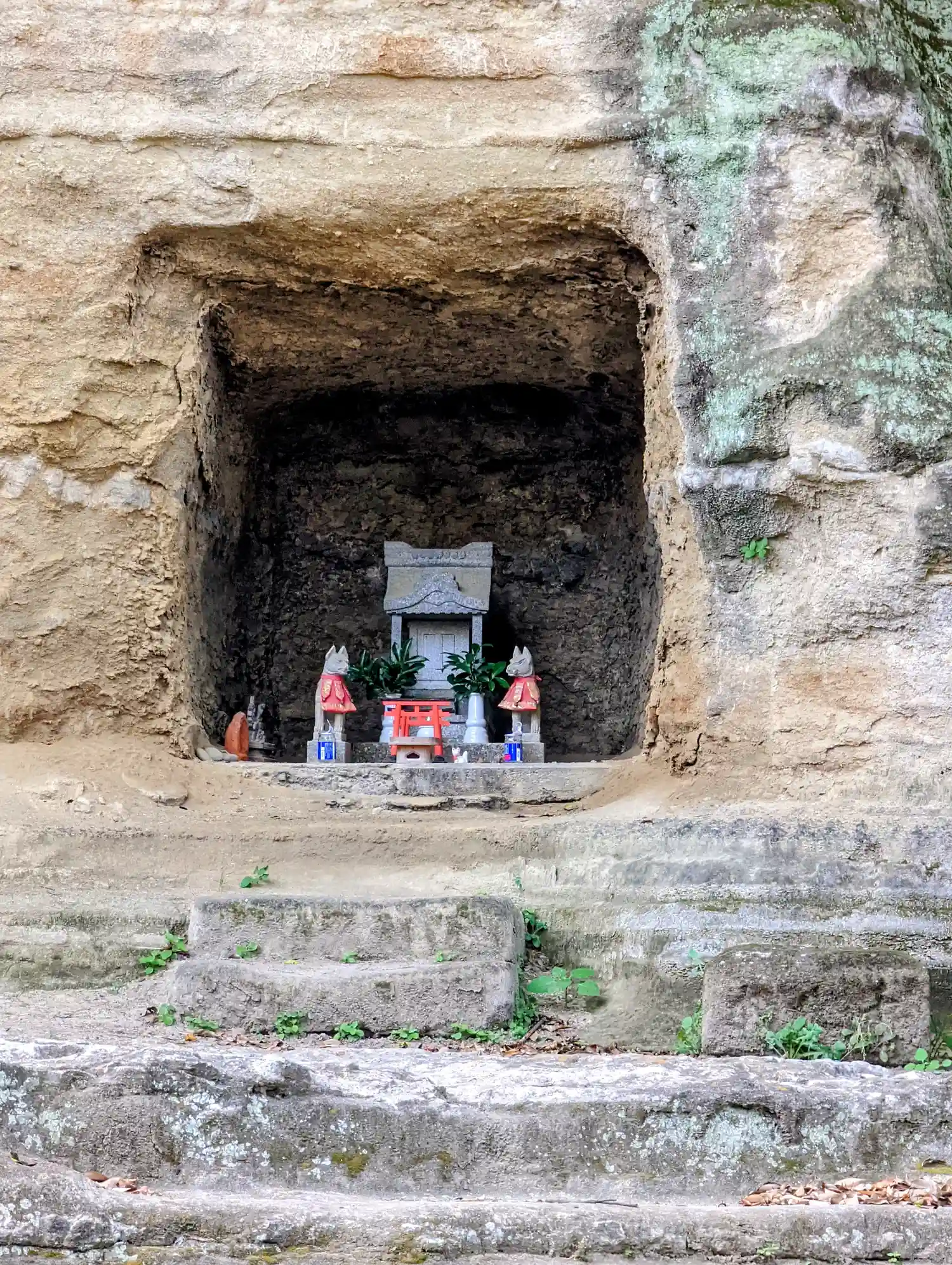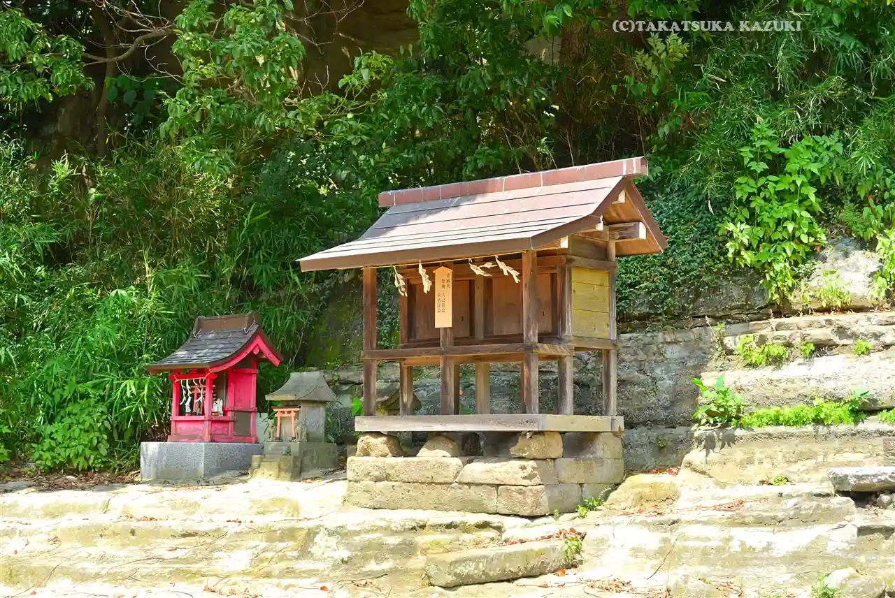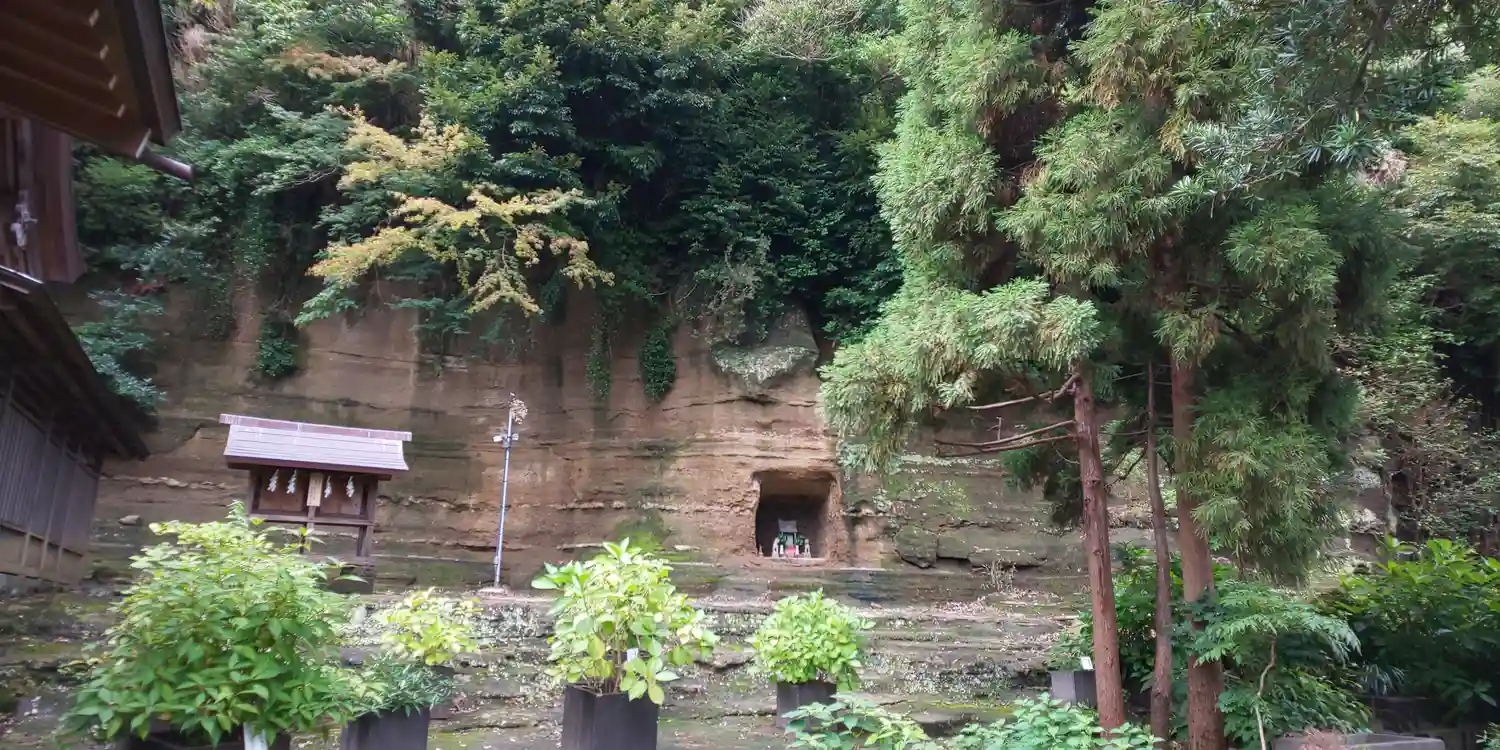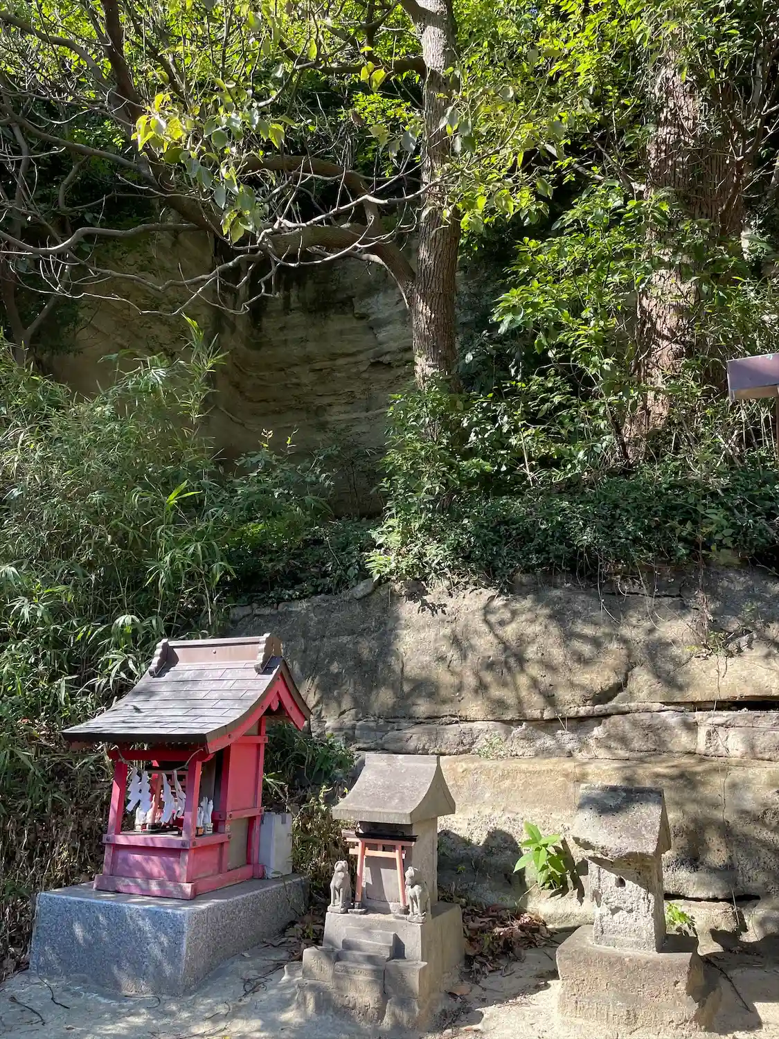 社殿背後の地層が露出した崖面には、お稲荷様が。