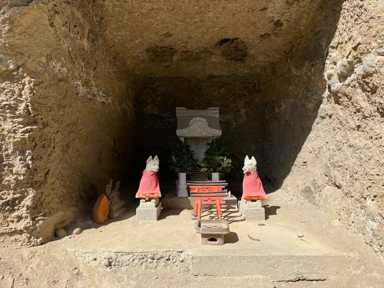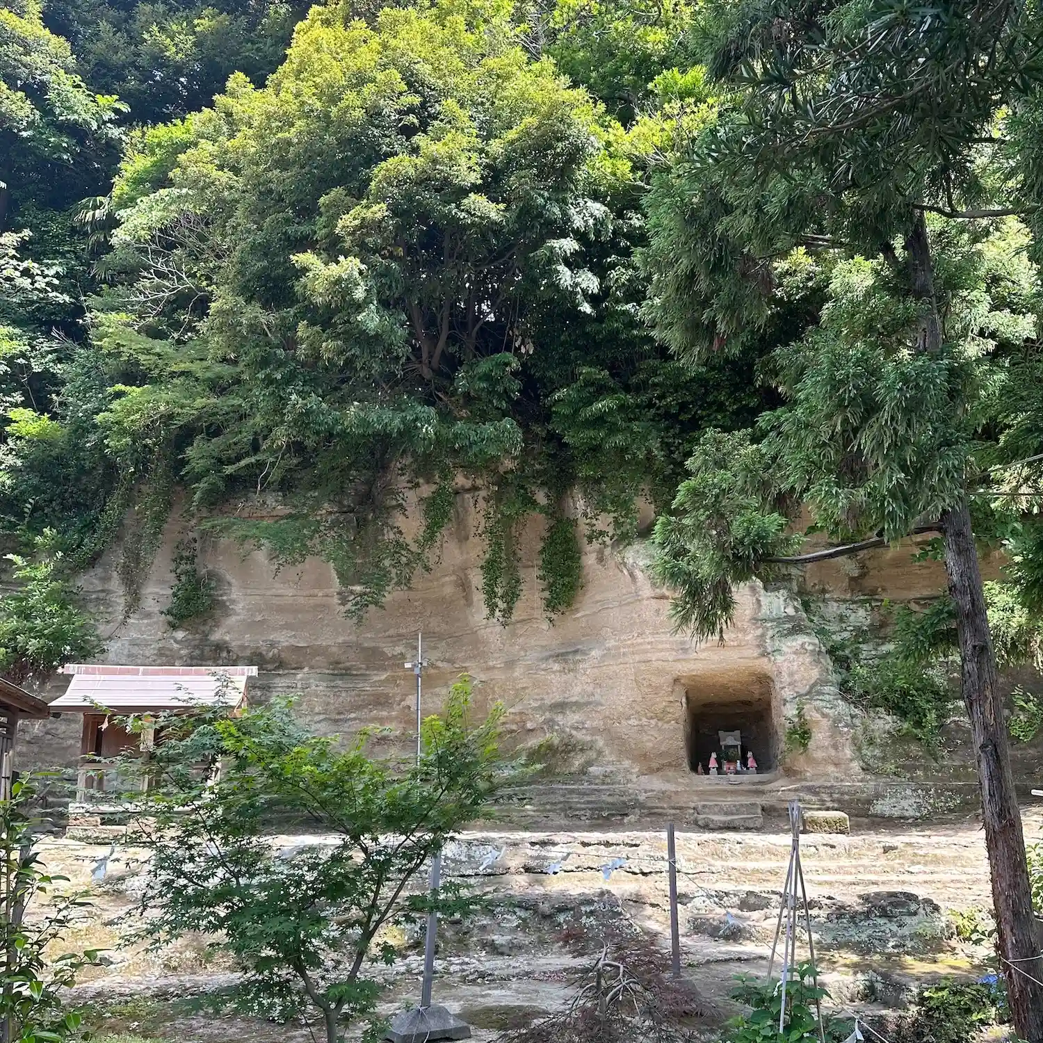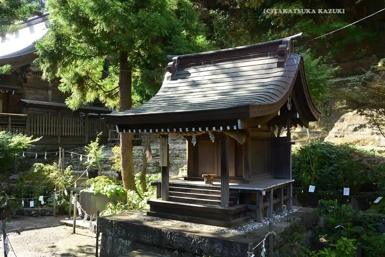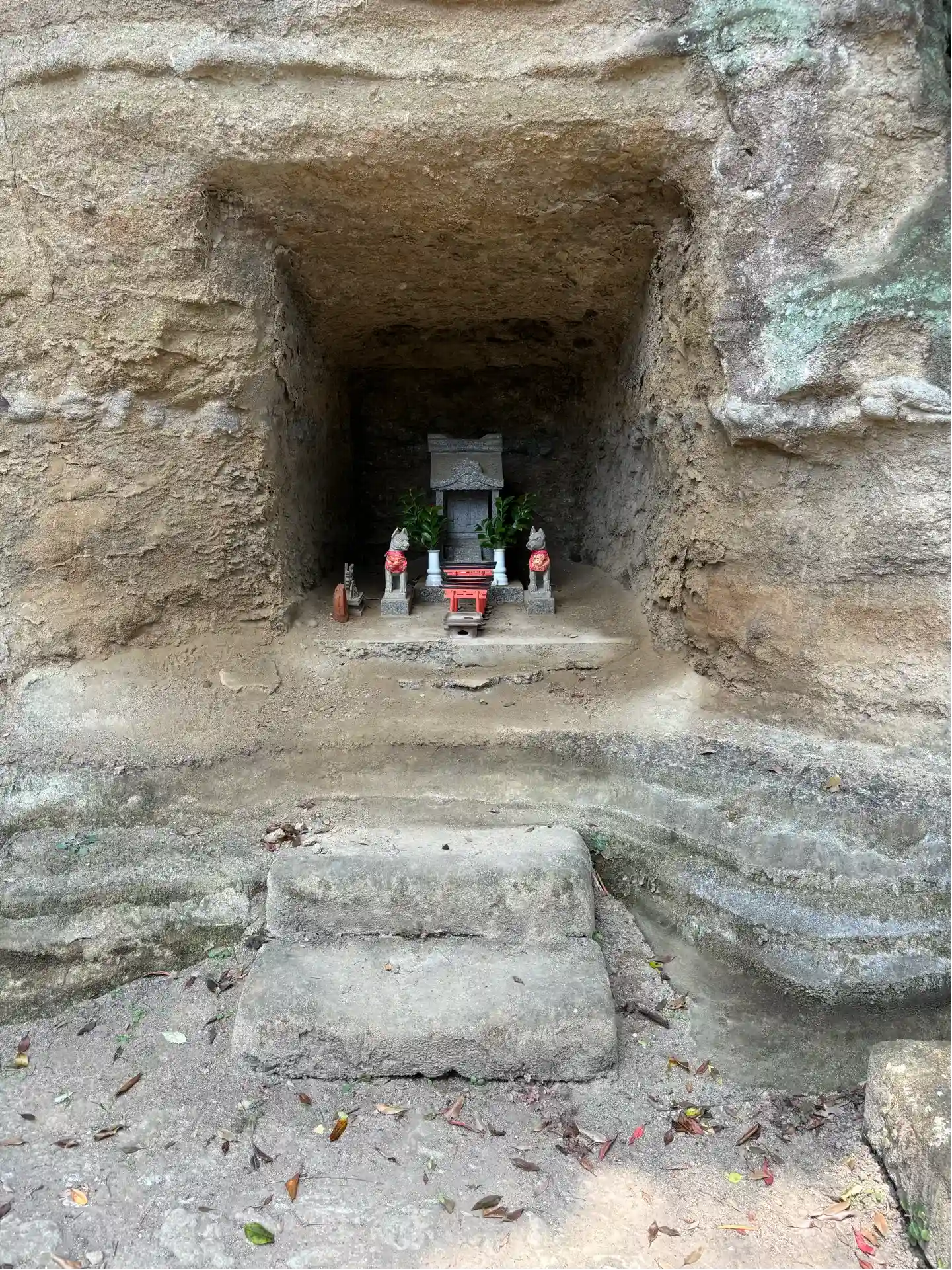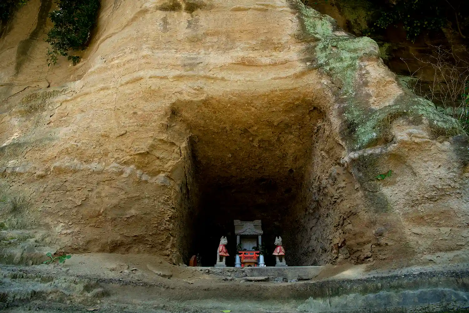 社殿背後の地層が露出した崖面には、お稲荷様が。