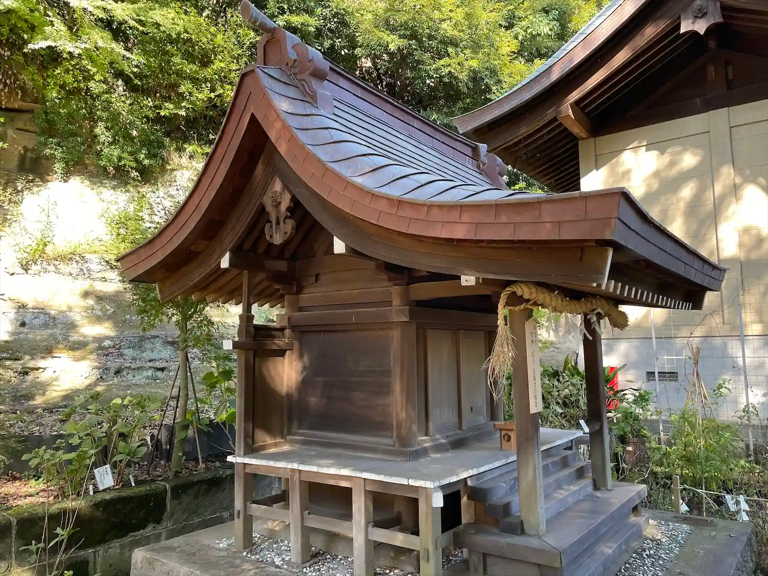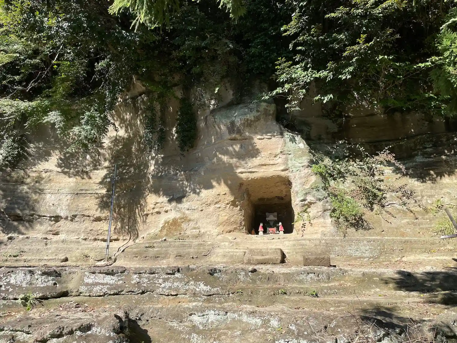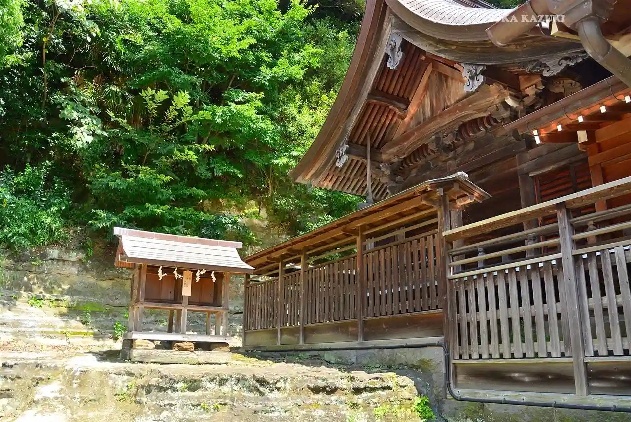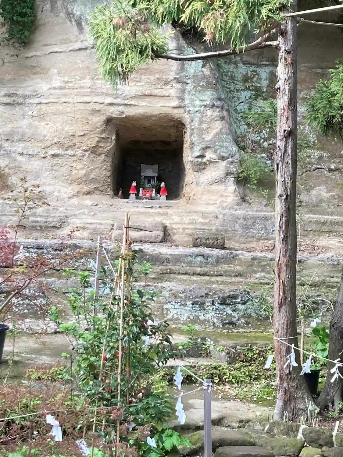 社殿背後の地層が露出した崖面には、お稲荷様が。