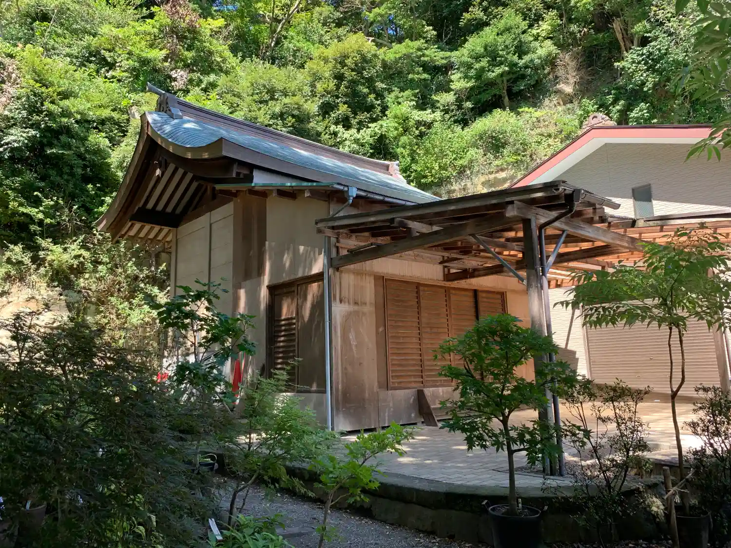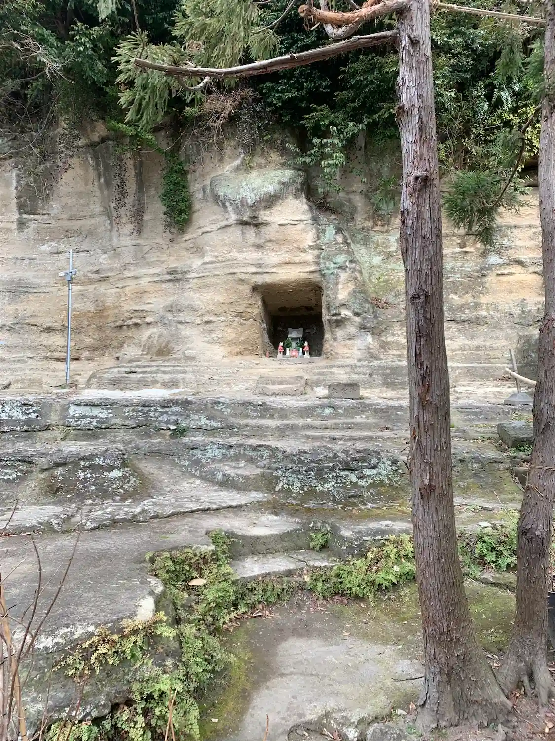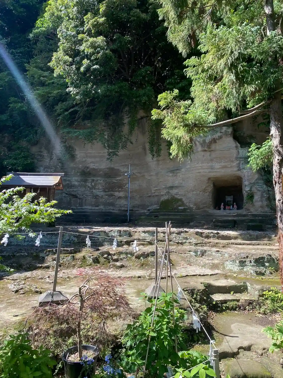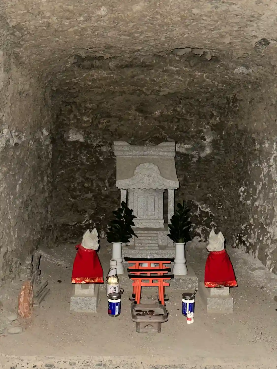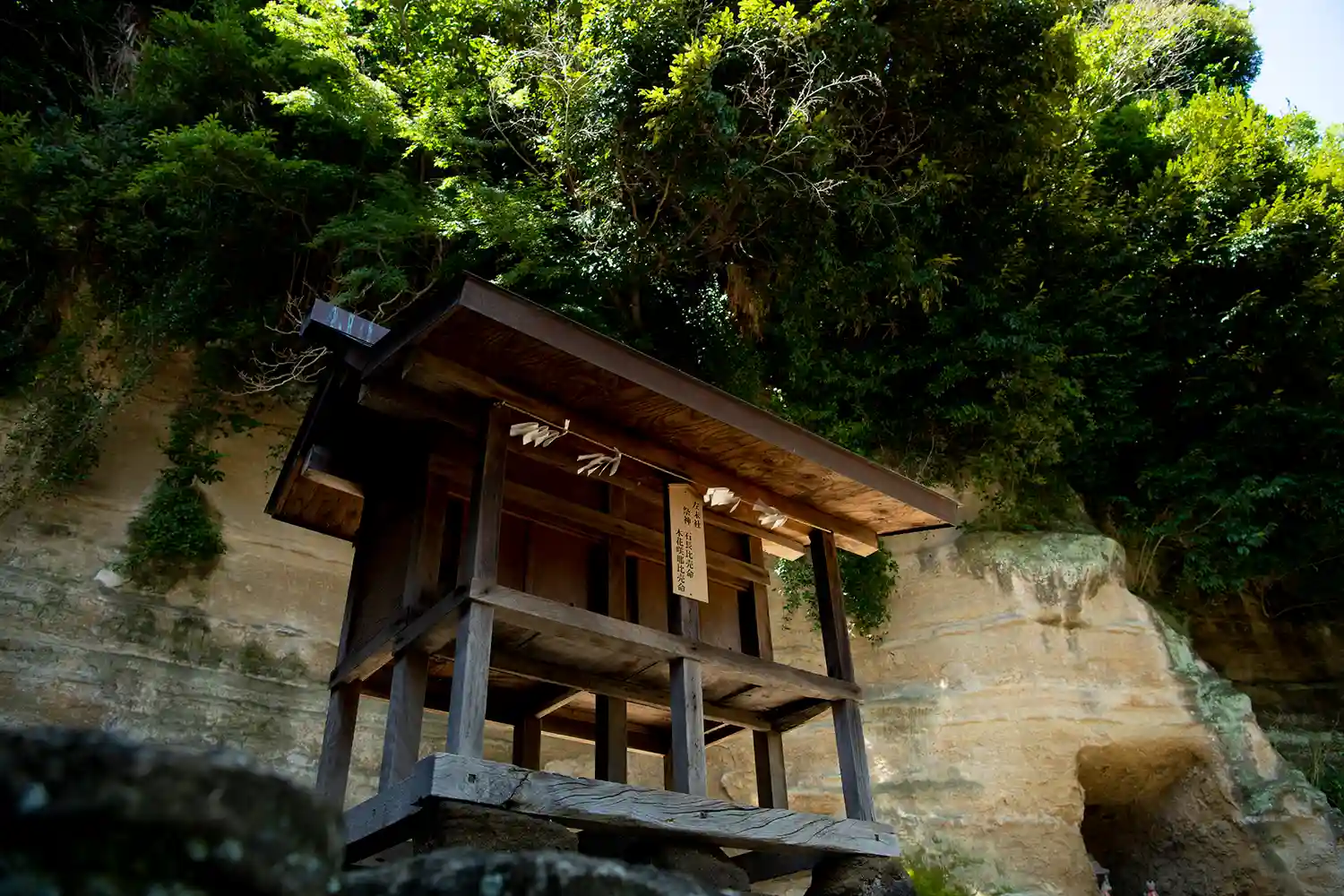 社殿背後の地層が露出した崖面には、お稲荷様が。