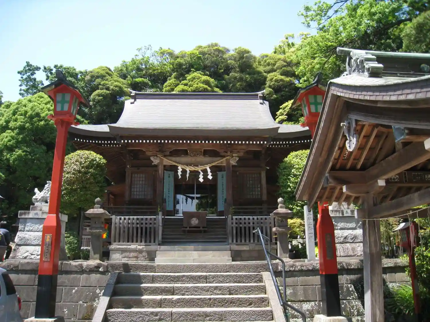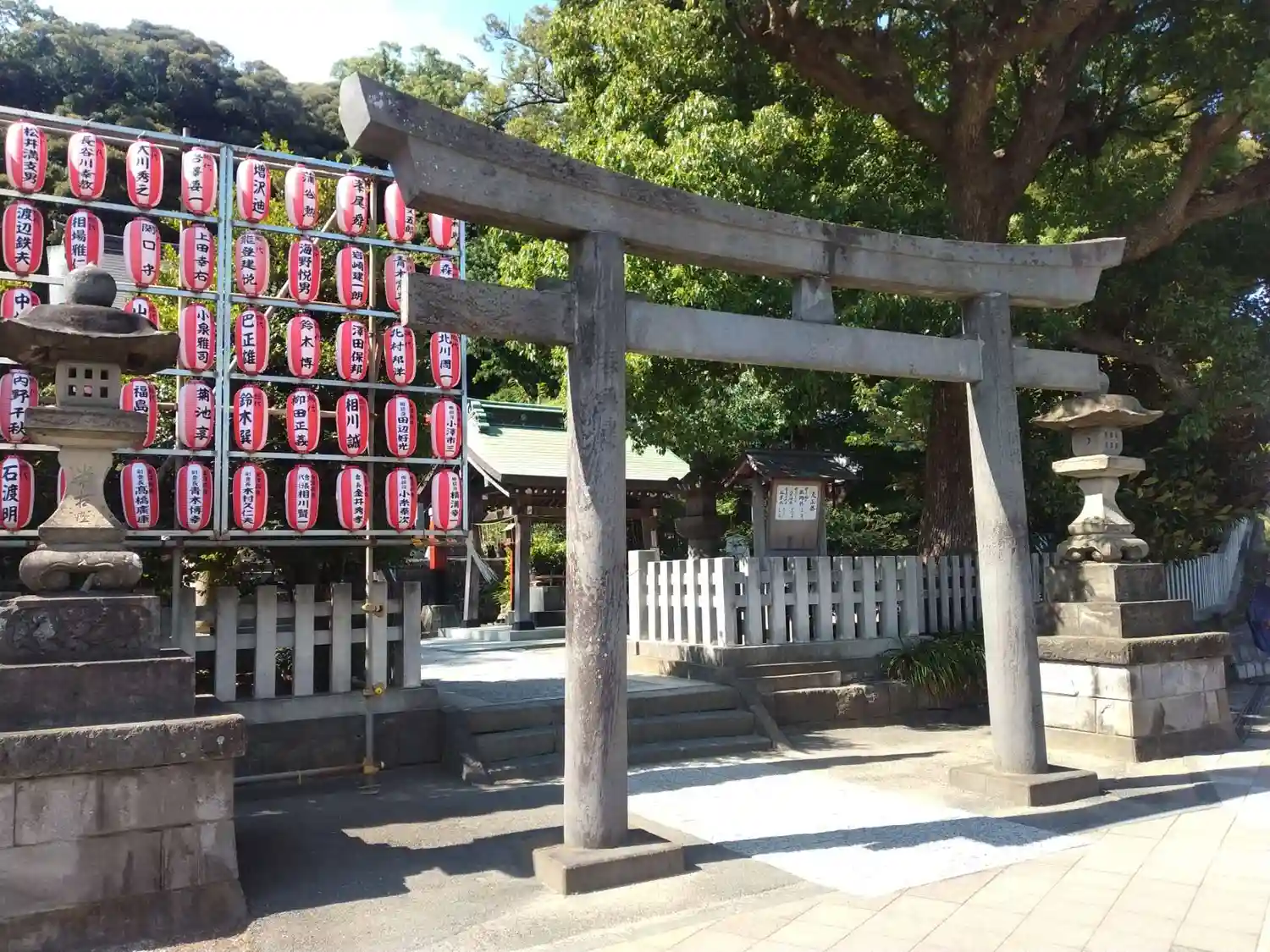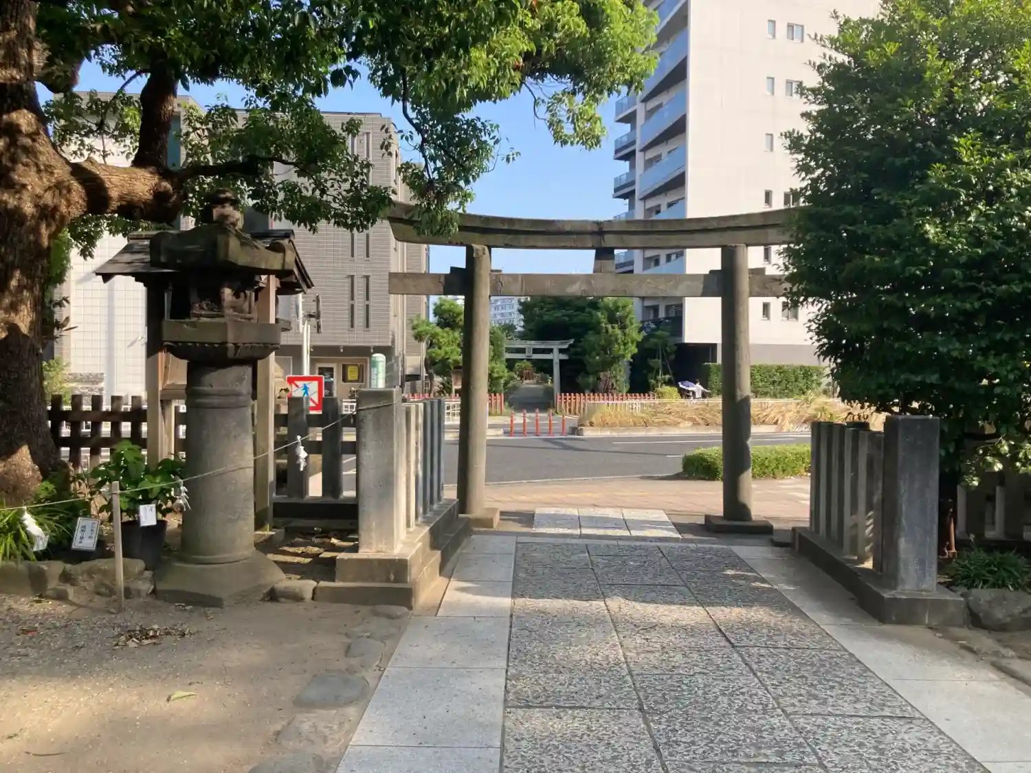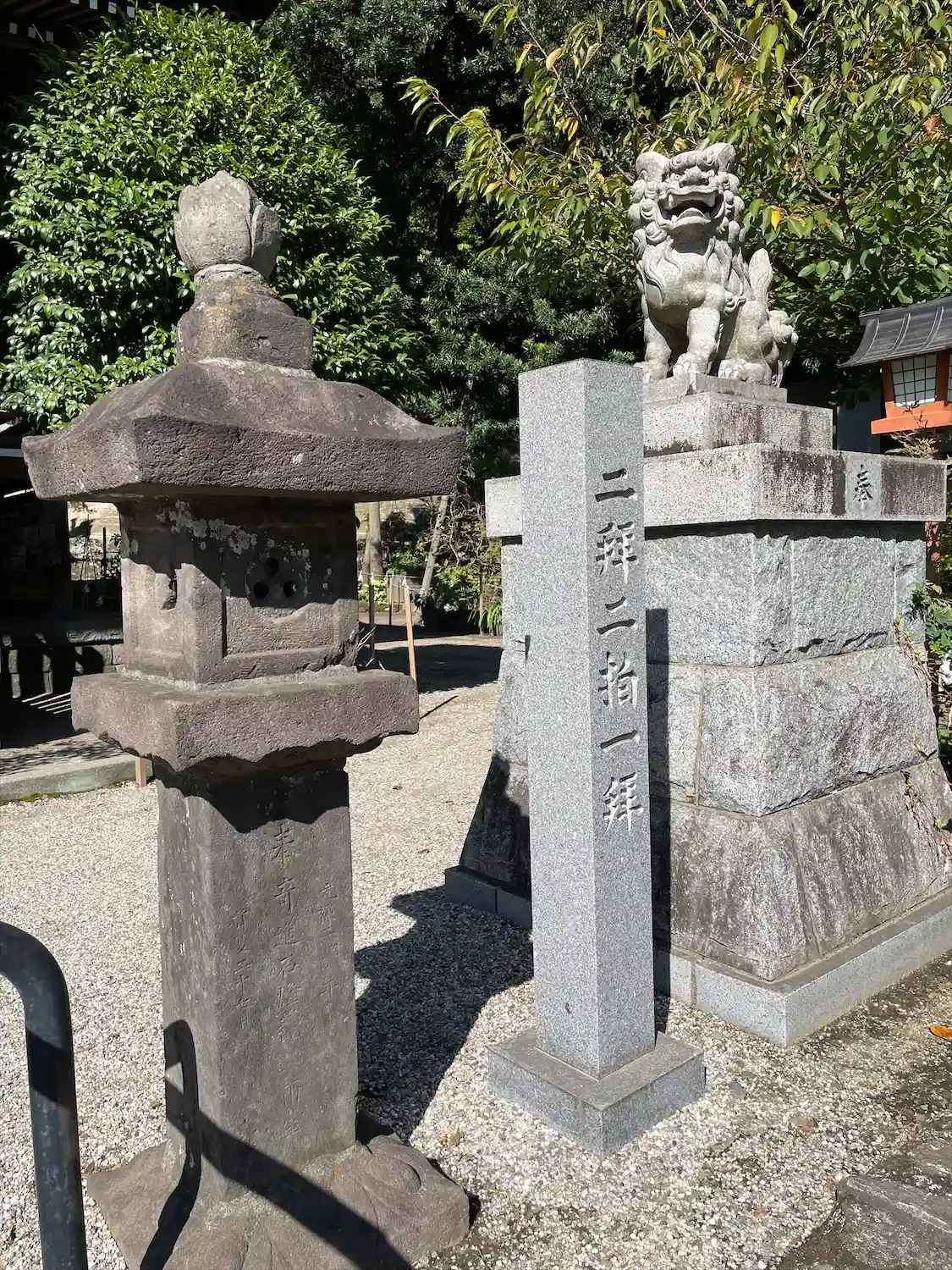 01-2) 向かって右斜め前から、鳥居 と 右側の燈籠。