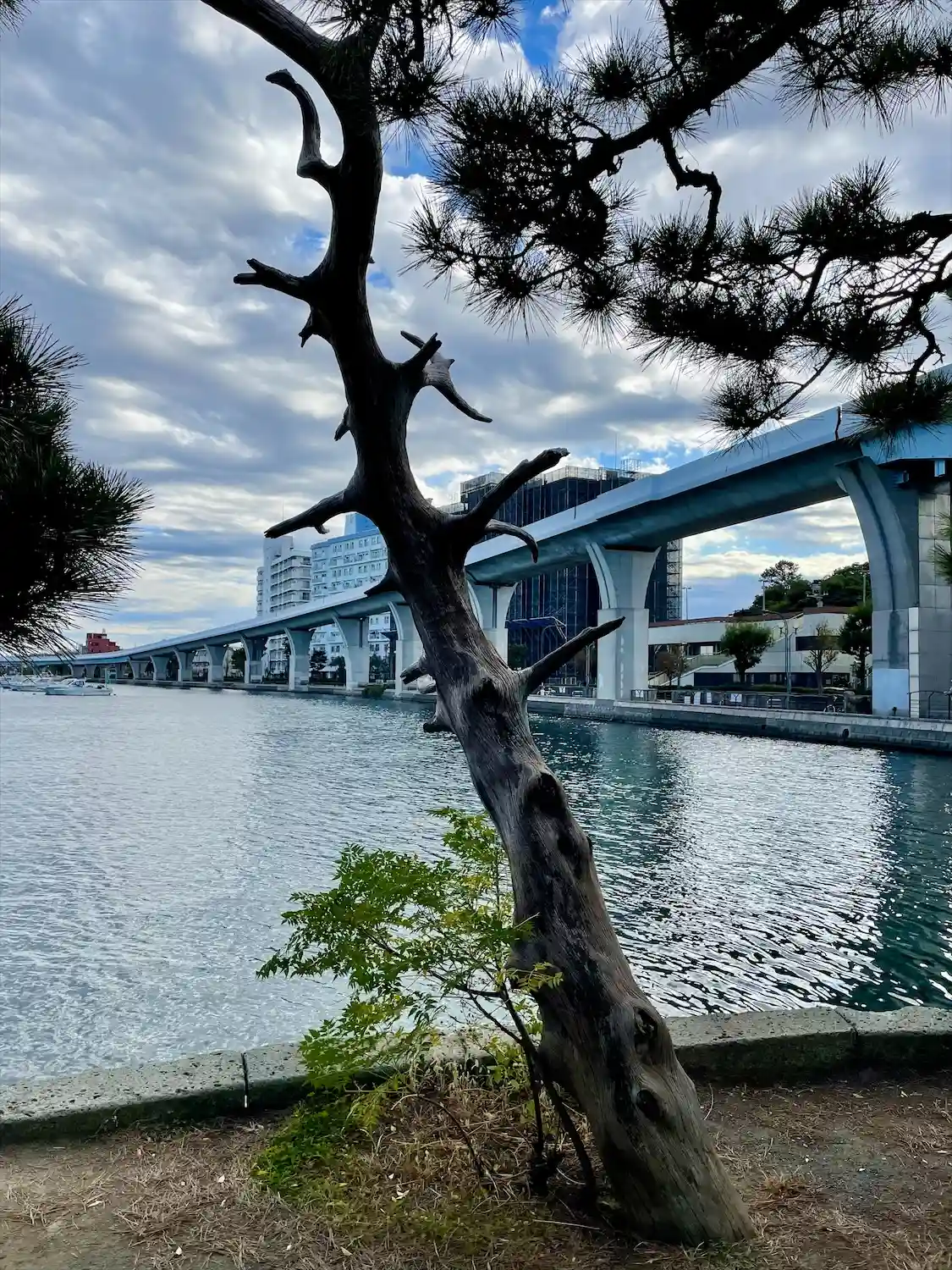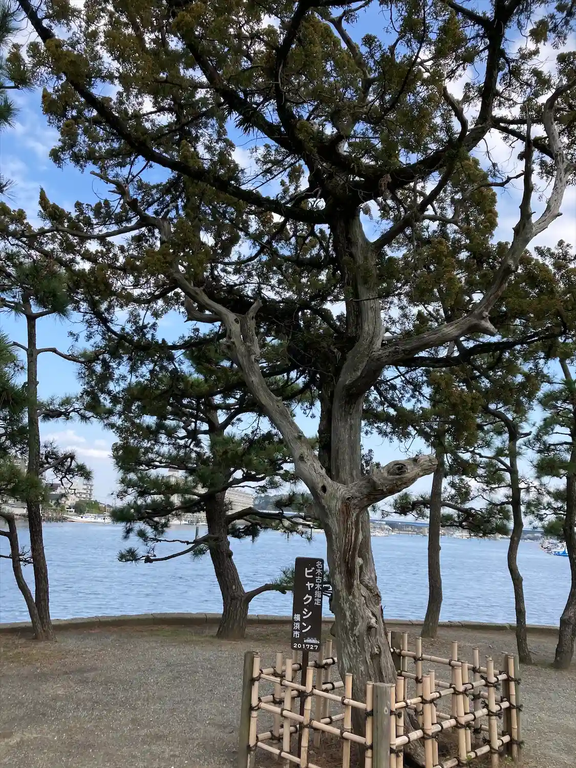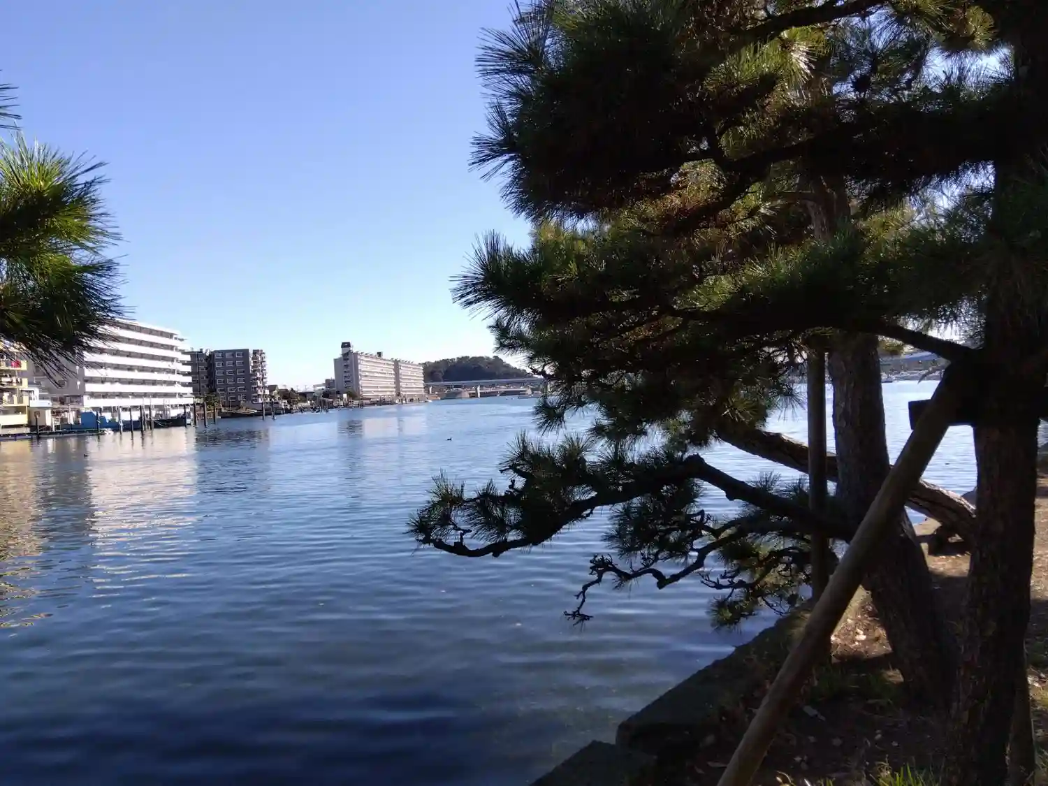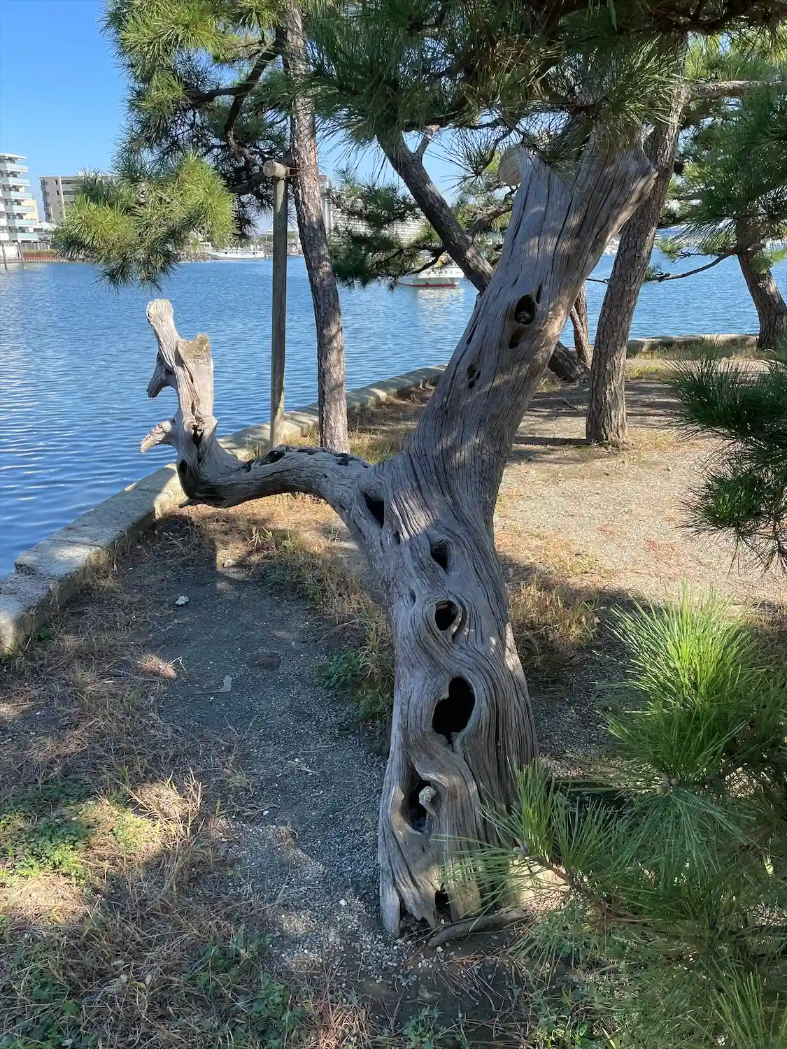 松の枝の向こうには、直近に道路やマンションがあって、不思議な光景