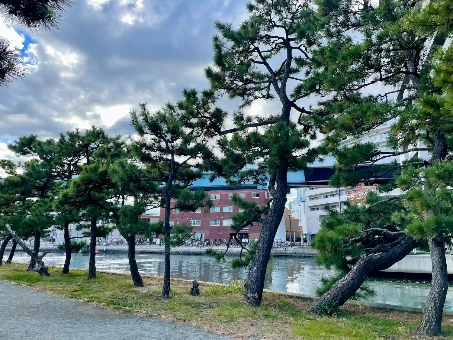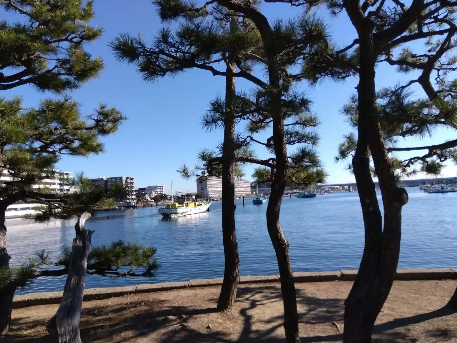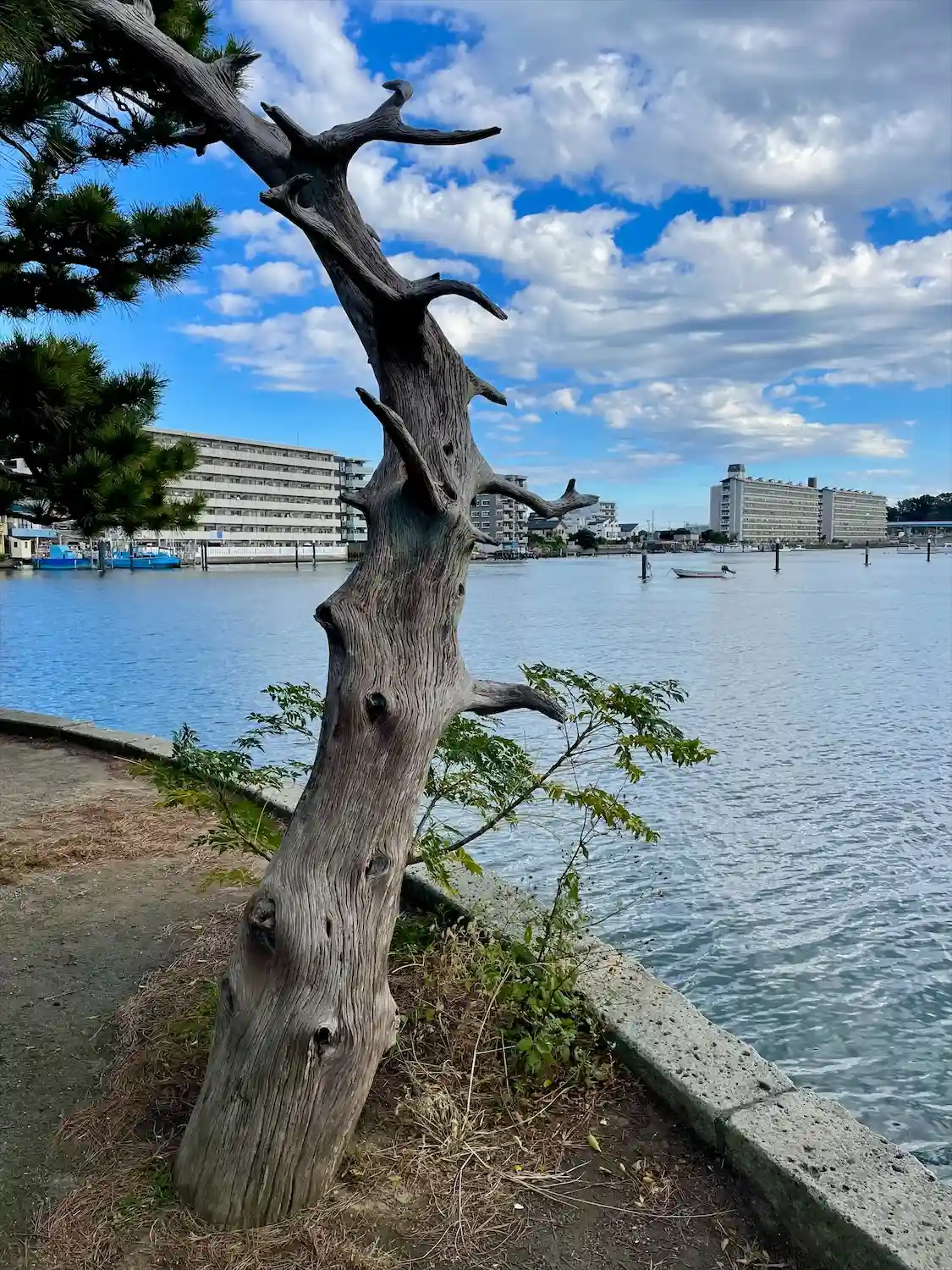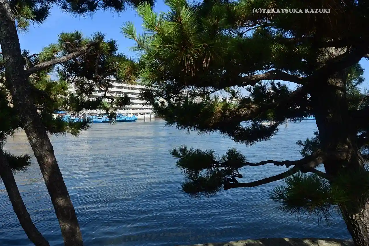 松の枝の向こうには、直近に道路やマンションがあって、不思議な光景