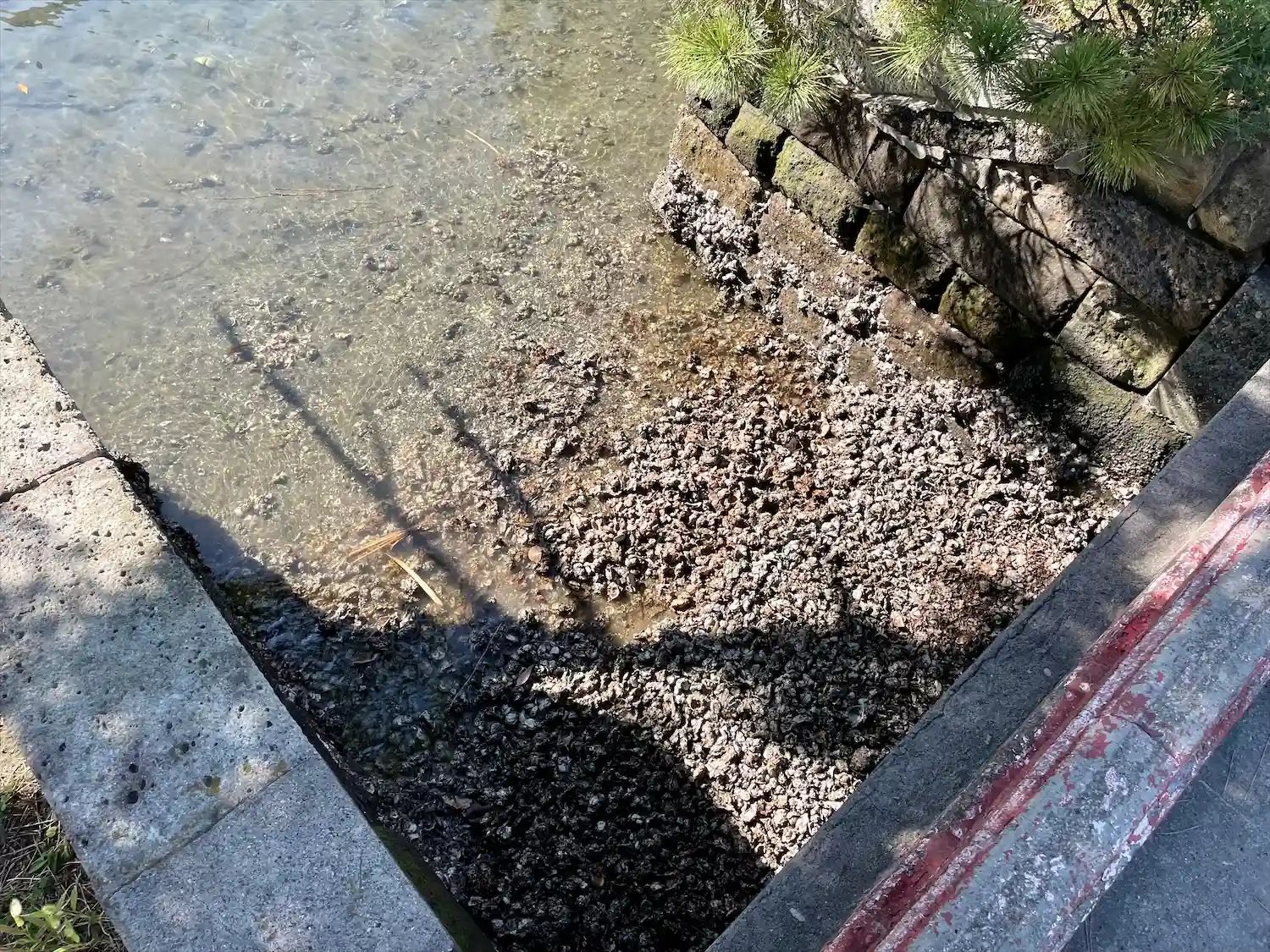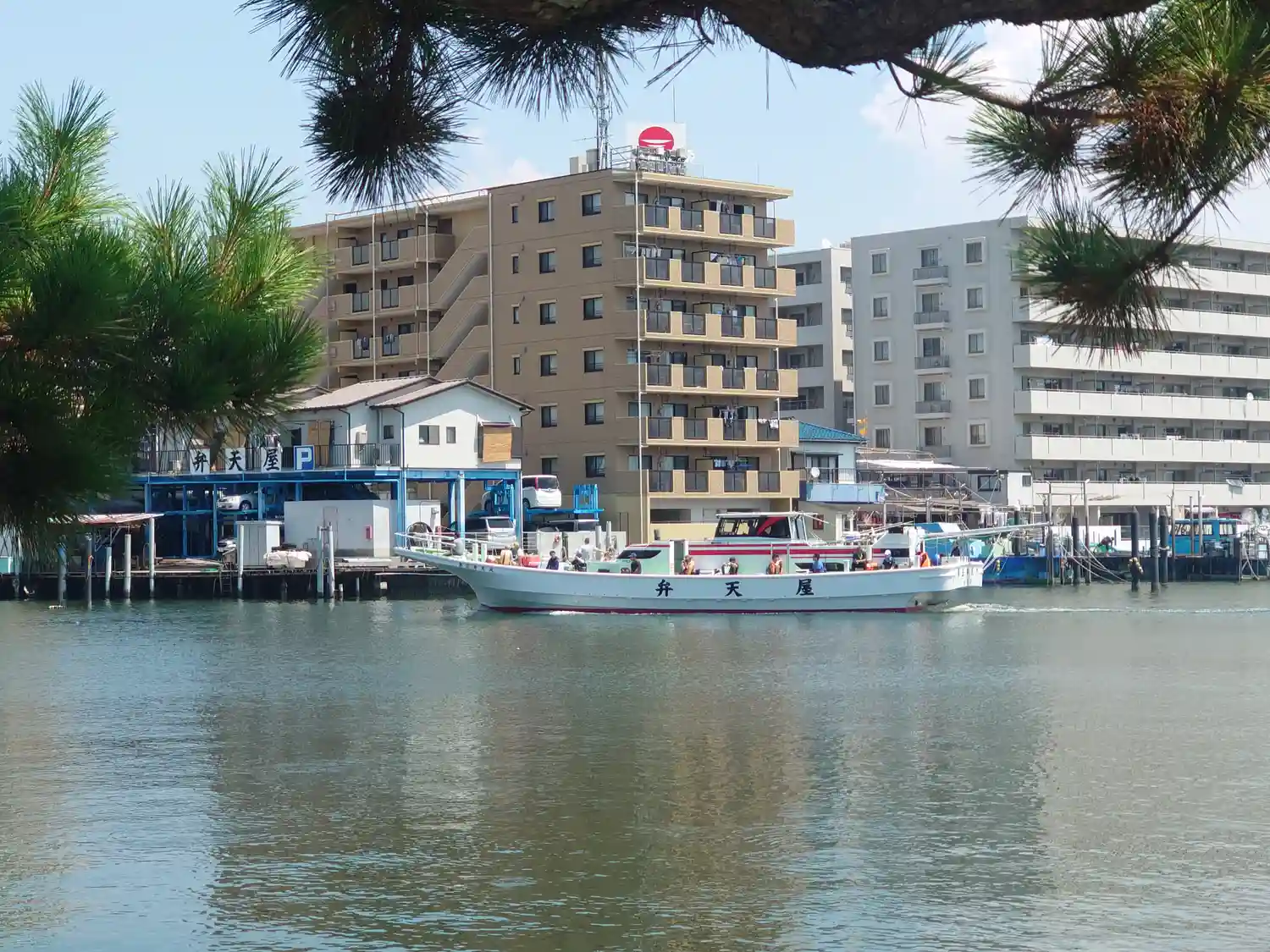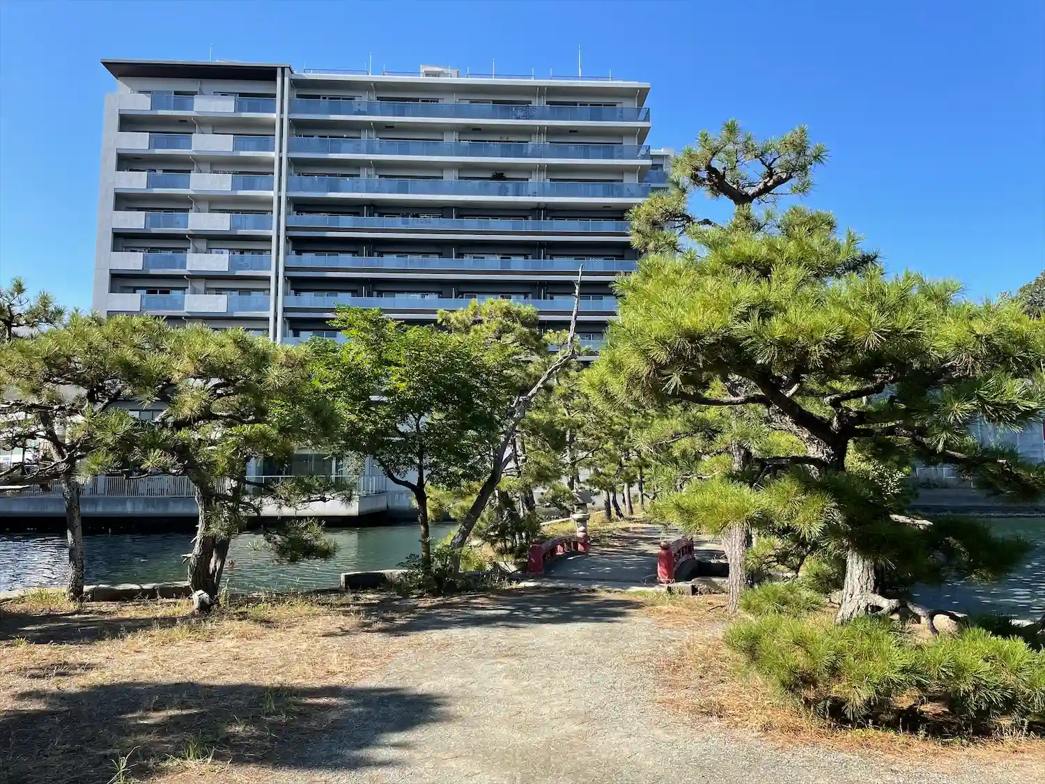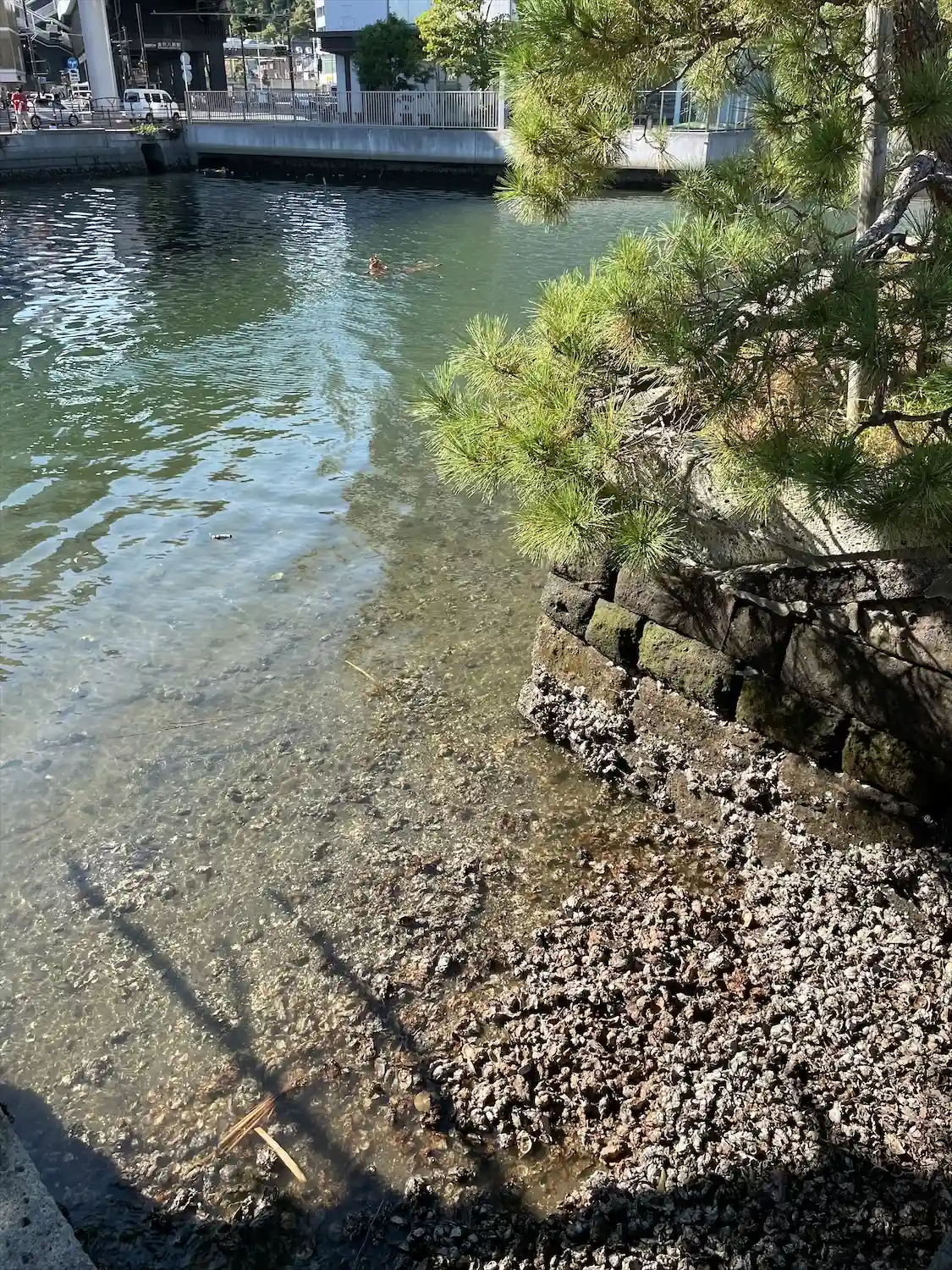 松の枝の向こうには、直近に道路やマンションがあって、不思議な光景