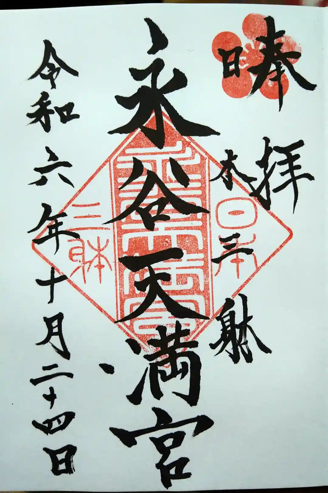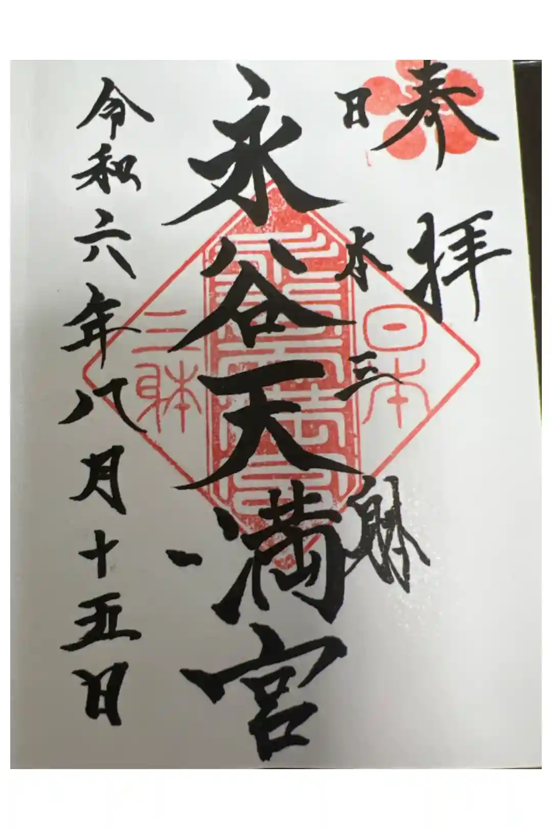 菅原道真が自身の姿を彫刻した3体の木像のうちの1体が永谷天満宮にまつられていることから、「日本三躰」の印が押されています。 | |||