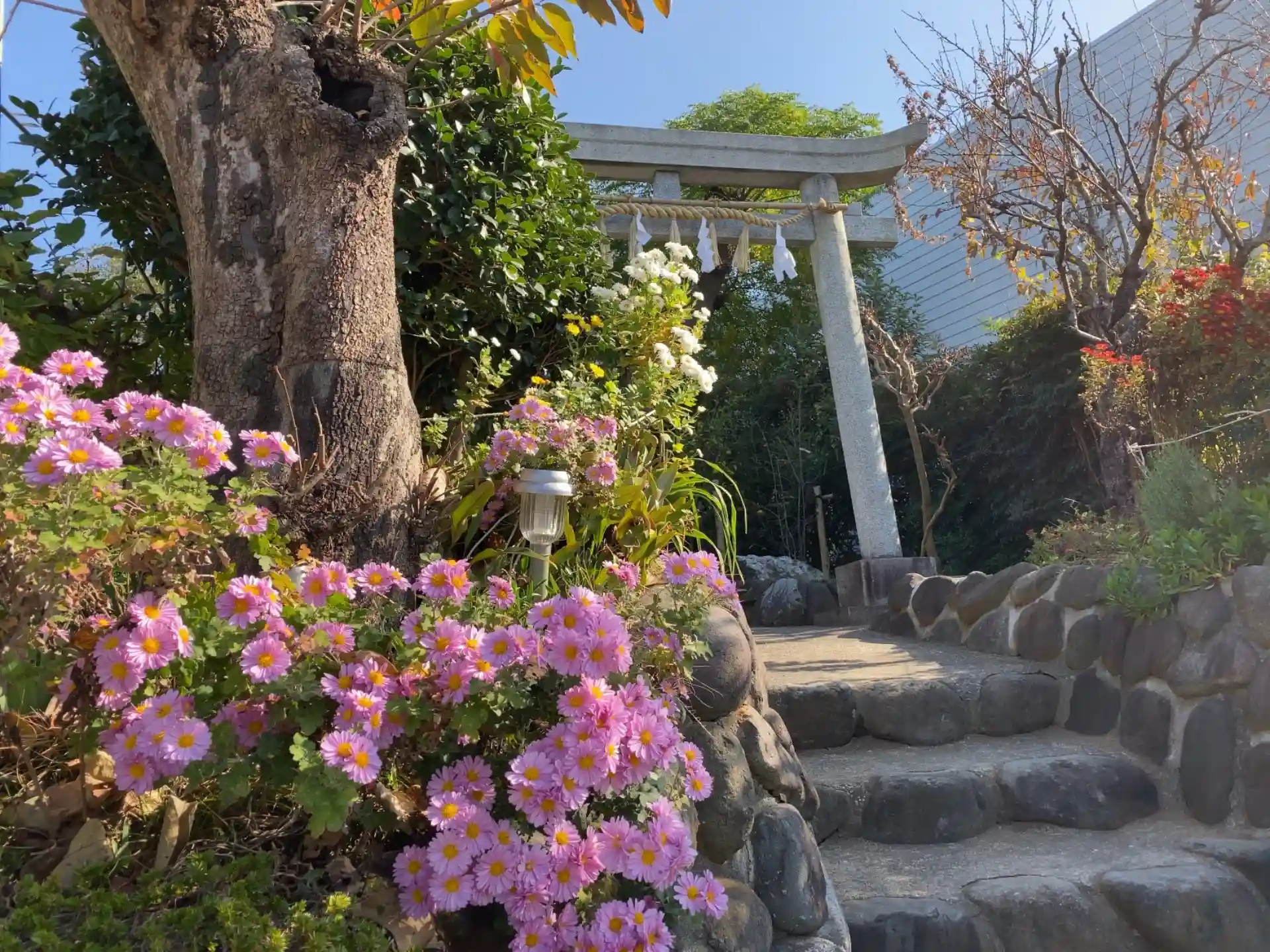 鳥居のもとにピンクの小菊。
