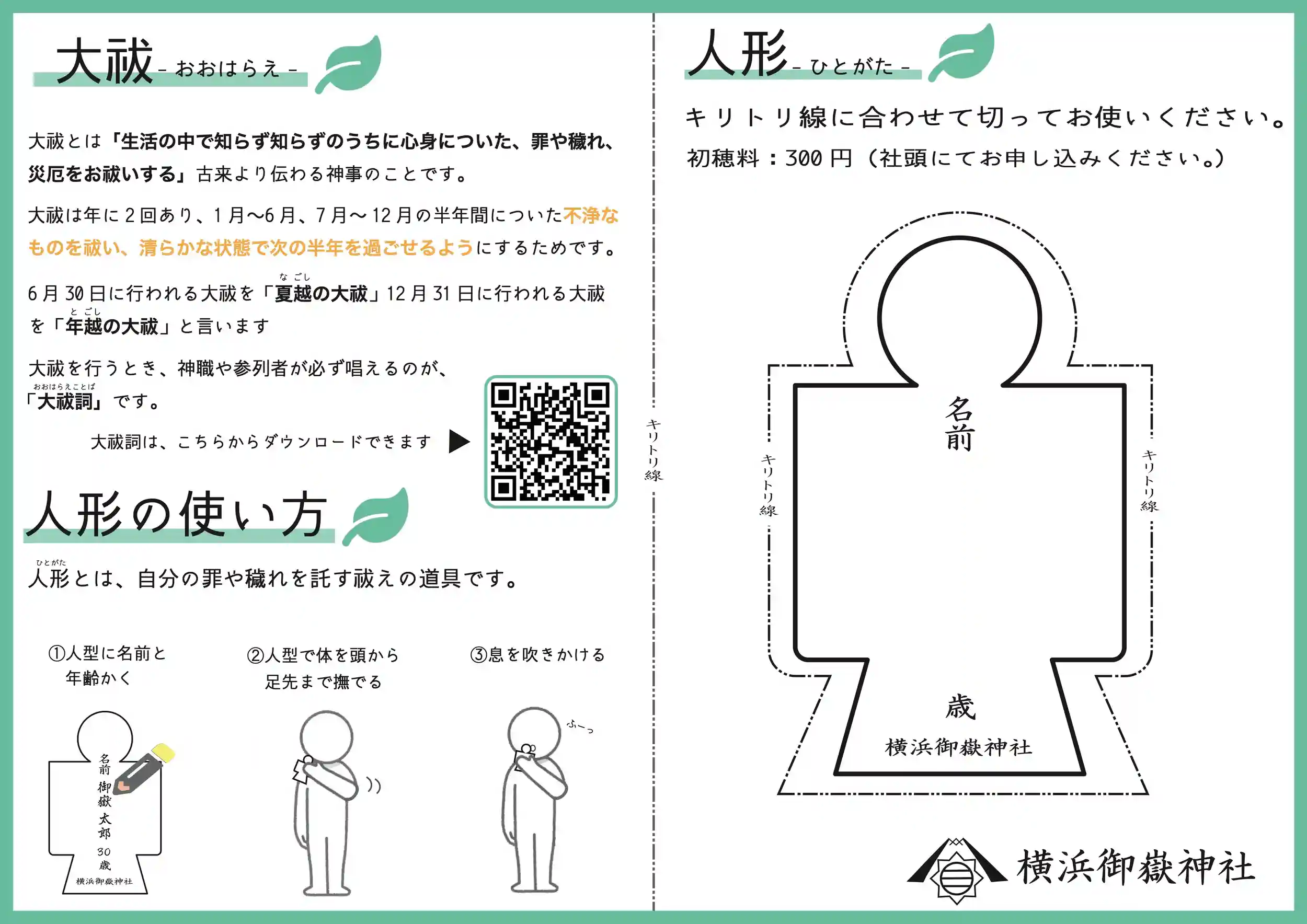 大祓の行い方や、大祓詞(おおはらえことば)のダウンロードできるQRコード、人形の周りに切り取り線を入れてみなさまが取り組みやすくなるように作成してみました。