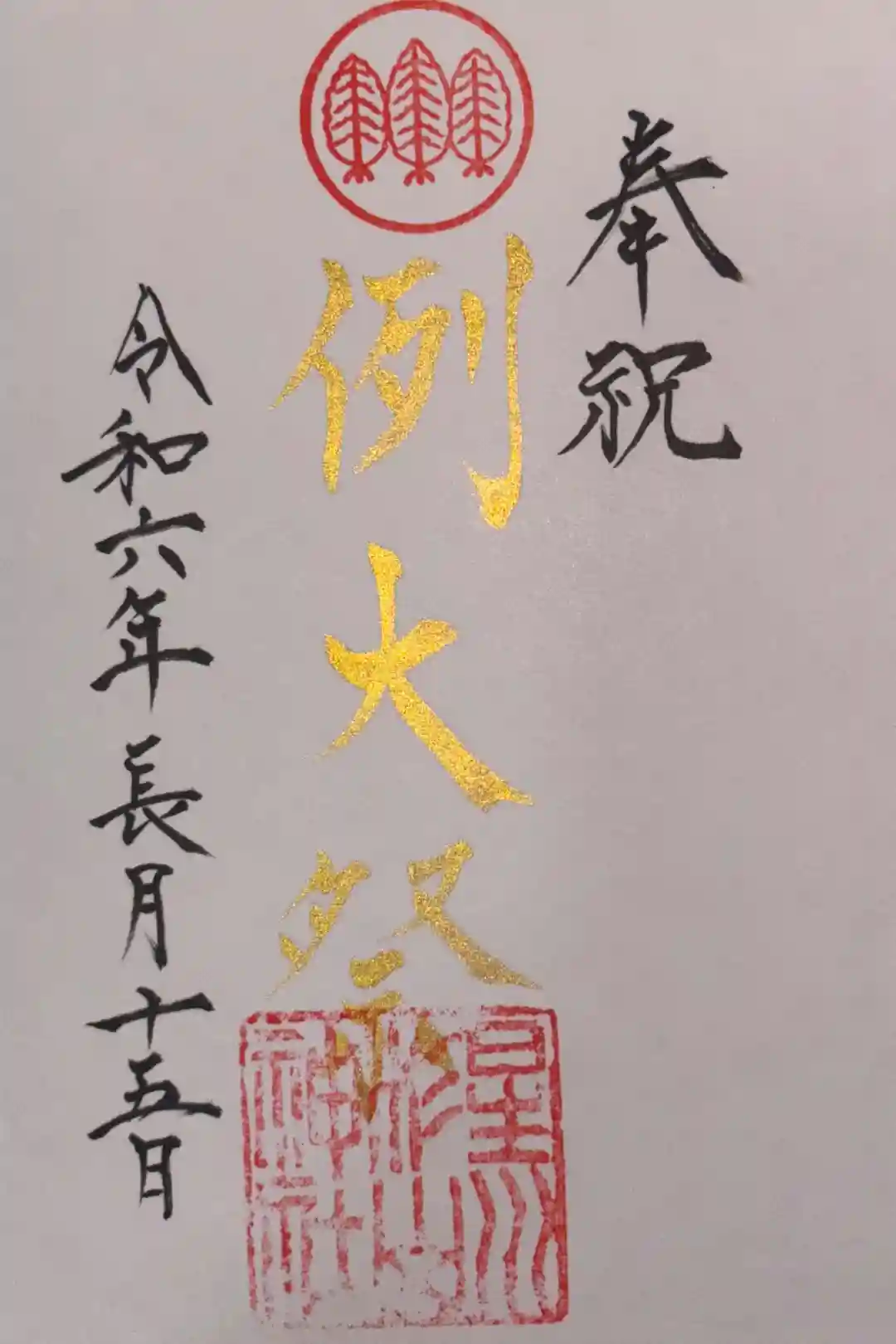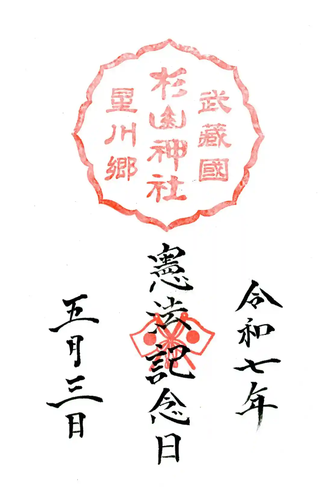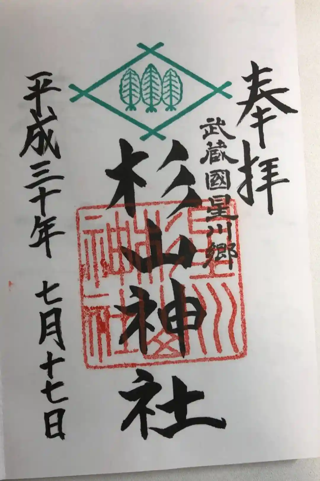 真ん中に杉山神社と書かれ、右上に武蔵國星川郷の文字、上部に神紋である三本杉の意匠、真ん中に星川杉山神社の印が押されています。