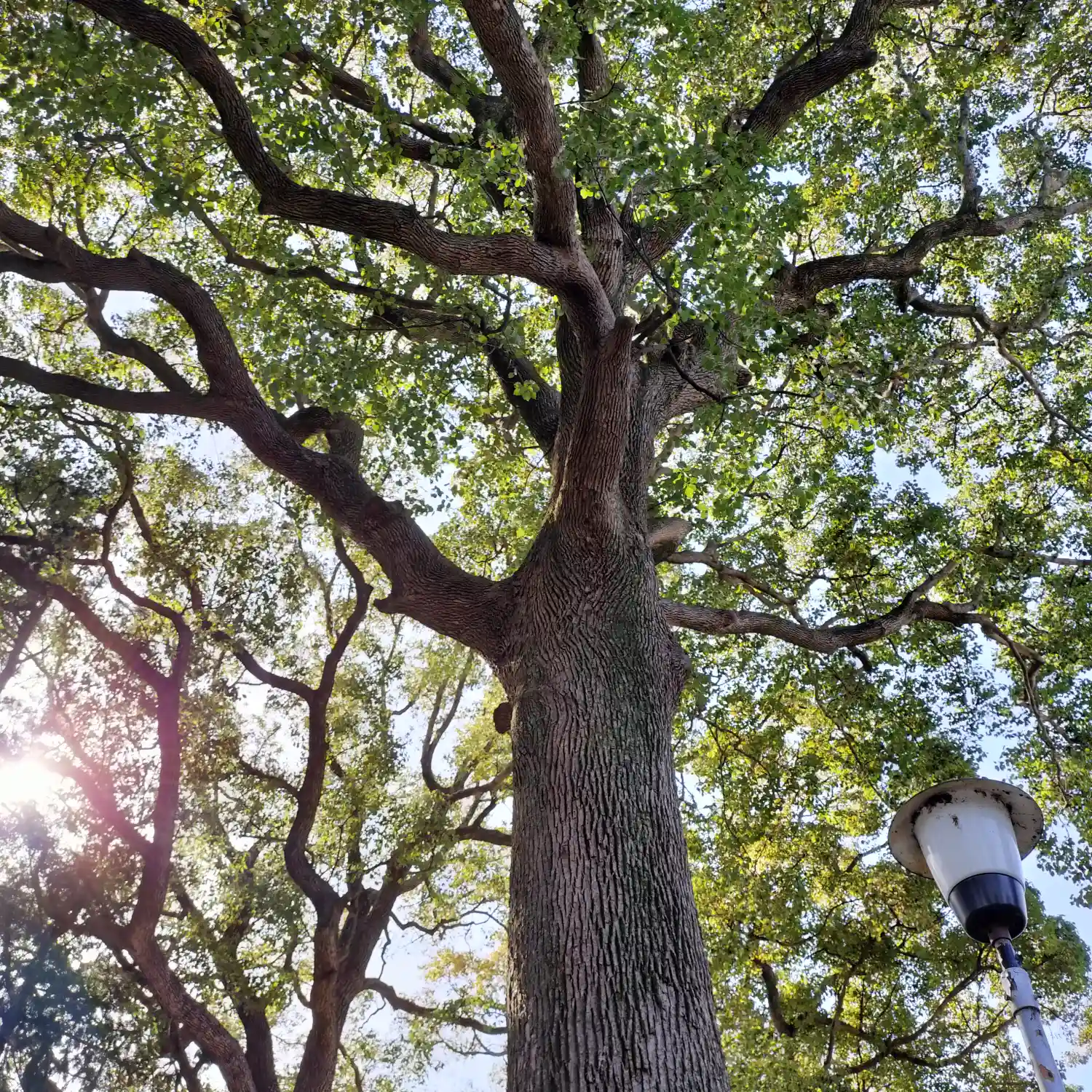 参道から上を見上げる。高い木が立ち並び歴史を感じさせてくれるが、本数をうまく調整していて、境内は明るくて気持ちが良い。昔は鬱蒼とした森だったらしい。