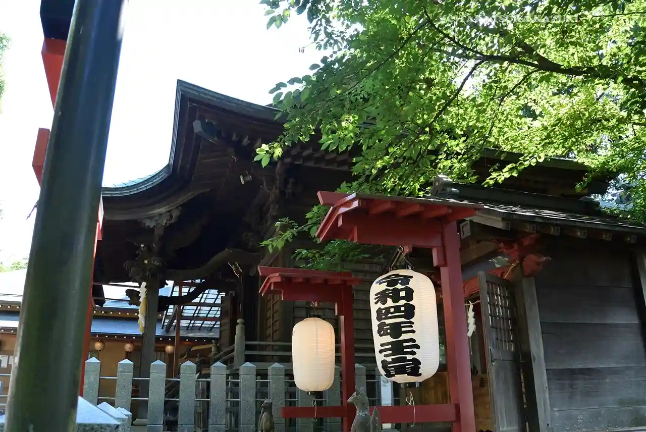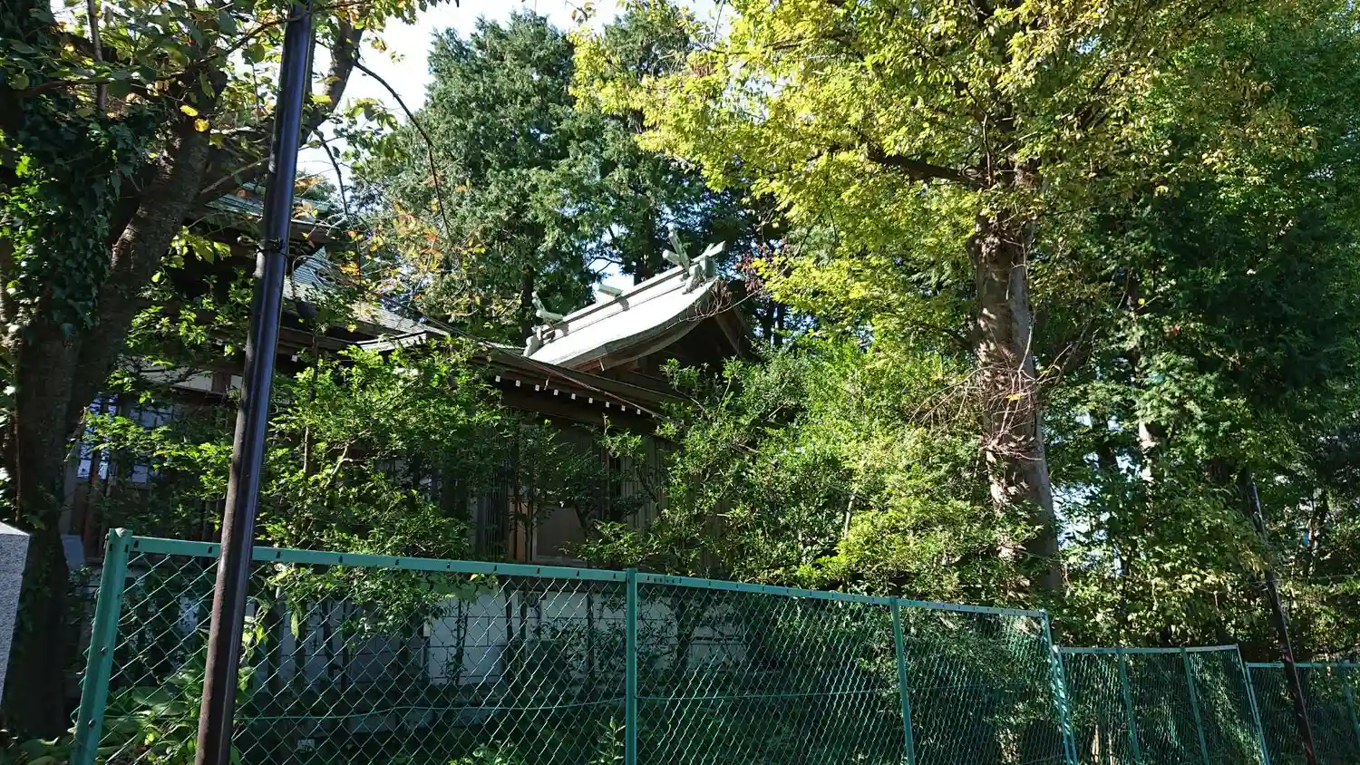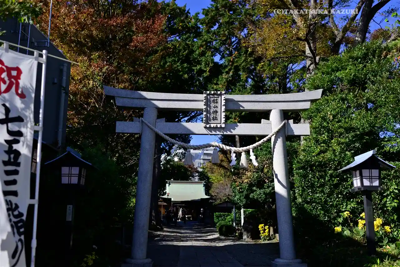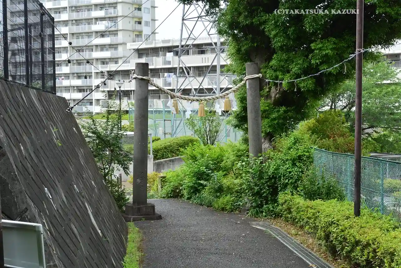 神社入口。鳥居と社標。南東側(マンション街の反対側)にある。マンション街側の北西側にも入口がある。