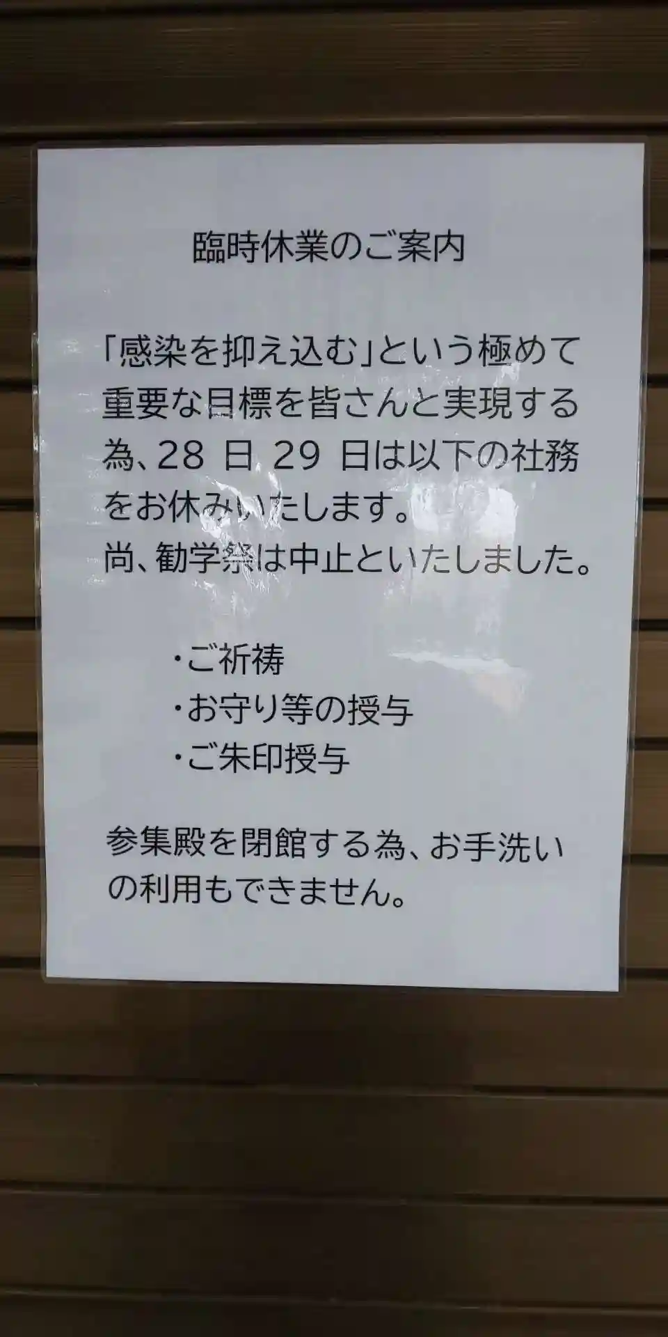 コロナウイルスの影響で社務所もお休みでした。