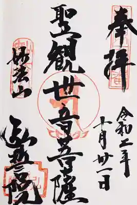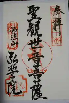 御朱印中央には、ご本尊「聖観世音菩薩」の文字が書かれています。右上には、弘法大師二十一ヶ所の第十番の印が押されています。 | |||