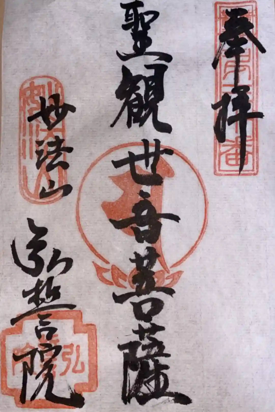 御朱印中央には、ご本尊「聖観世音菩薩」の文字が書かれています。右上には、弘法大師二十一ヶ所の第十番の印が押されています。 | |||