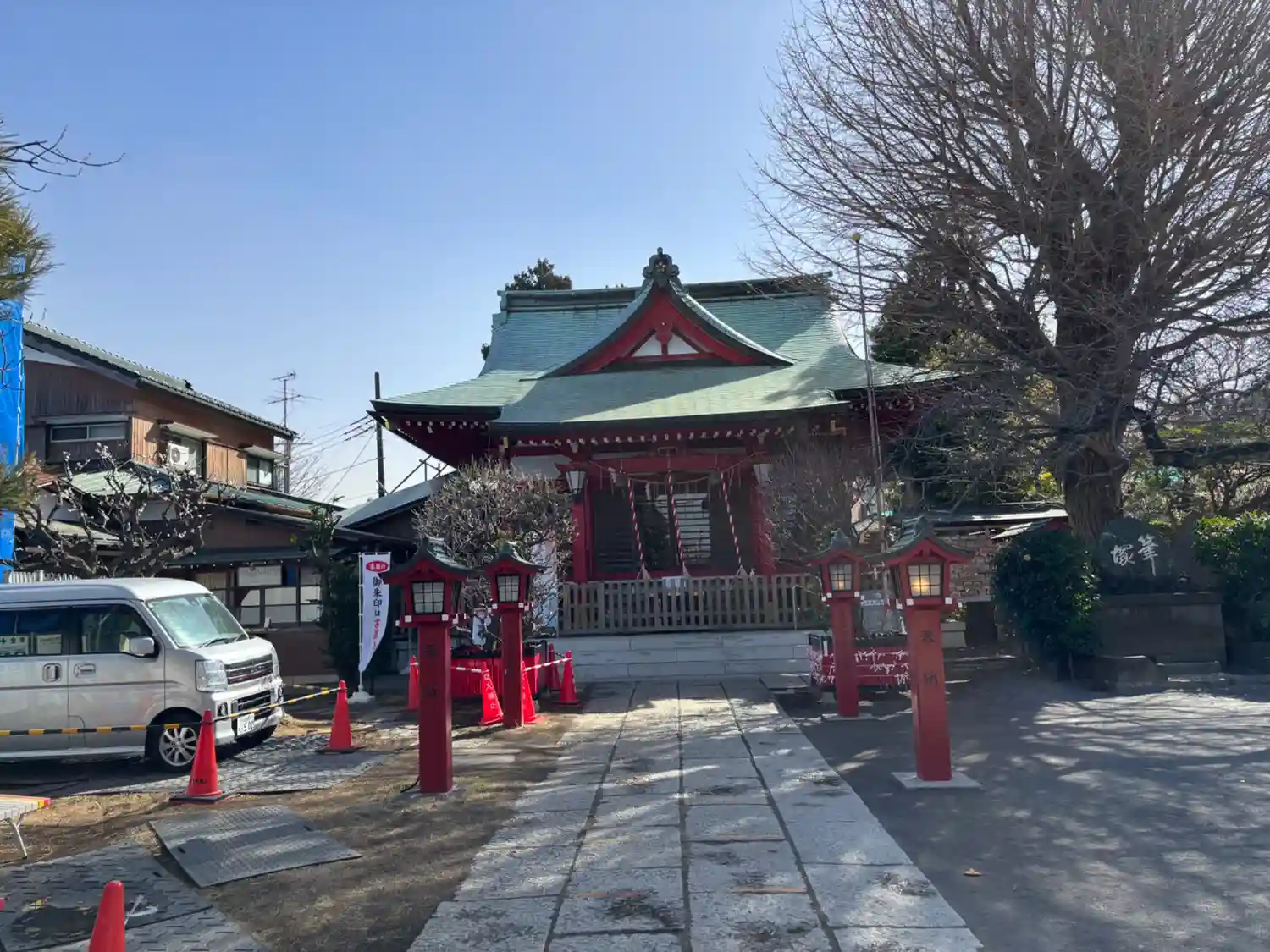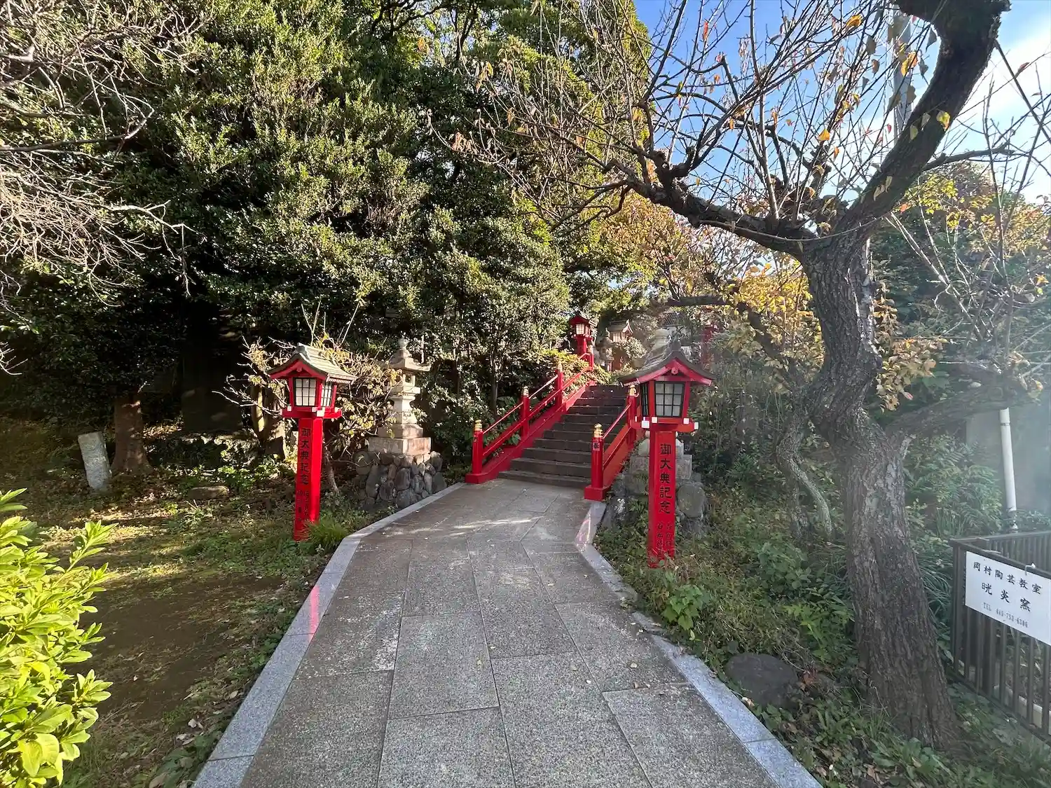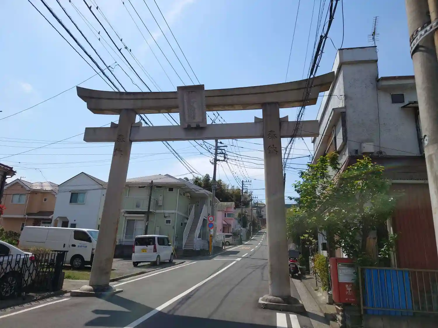 八幡橋から国道16号を少し戻って左折し、住宅街を通って岡村天満宮前交差点を過ぎて大きな白い鳥居をく…
