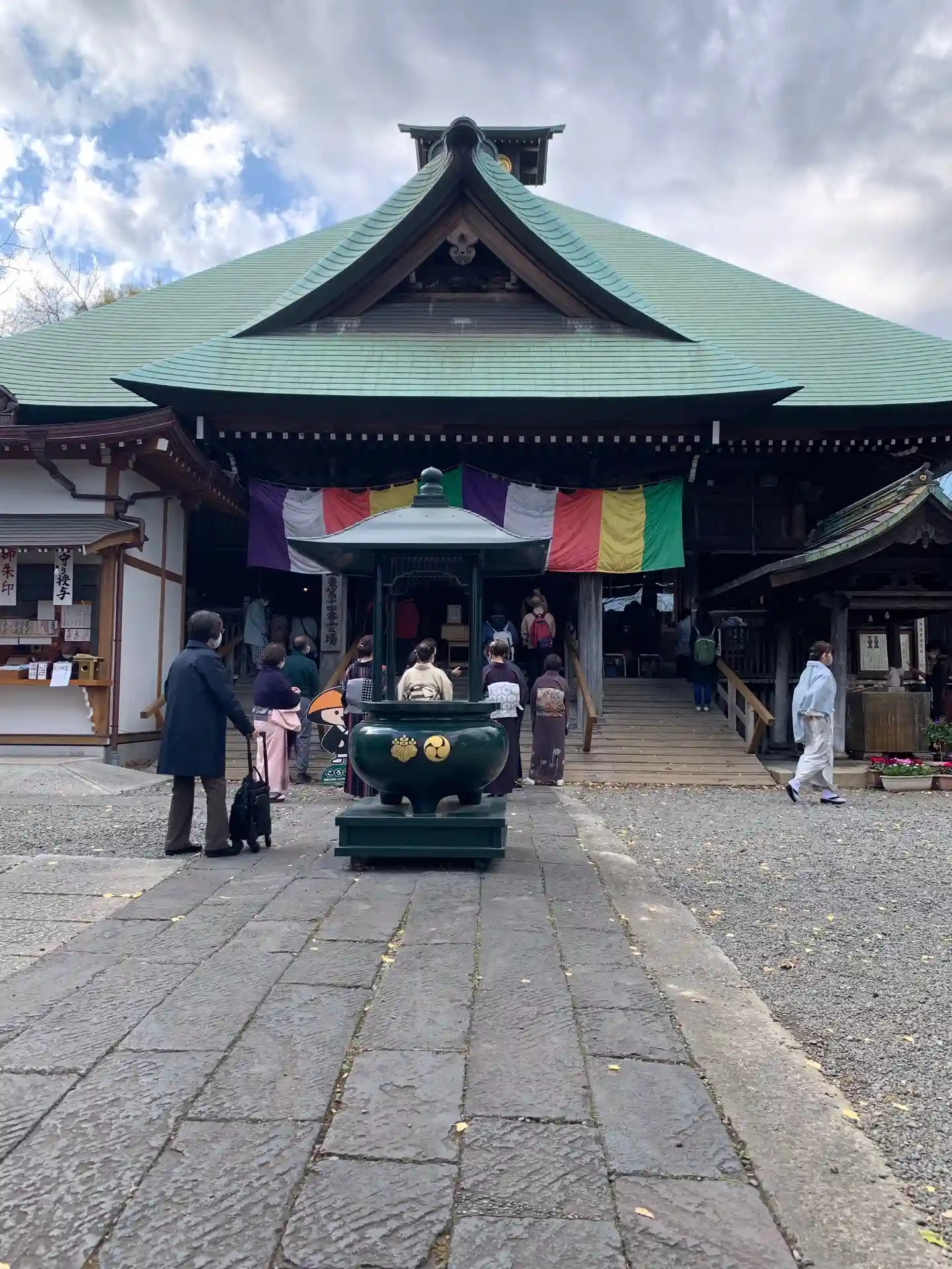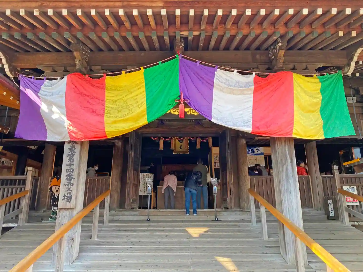 本殿正面、五色の寺幕。この日はたまたま本尊の<十一面観世音菩薩立像>が外部に貸出中で不在とのこと。観音像がないのにあった場所に向かって礼拝する、複雑な気分...