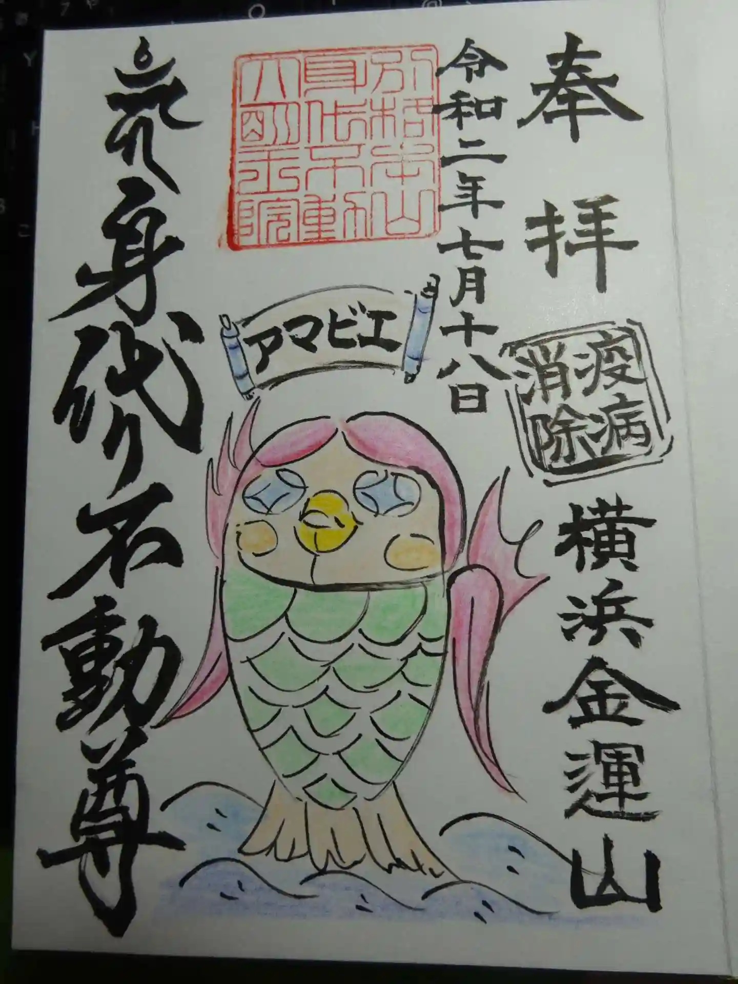 区切りの500投稿目は こちら!! この土曜日 予てから不調だったマイカーを新調^^(中古だよ~ん) いつもお清めに伺っている地元、身代わり不動尊へ納車直行お祓い祈祷に行ってきました^^ 時期外れでコロナの影響もあったのかこちらのお寺で数年前に続いて2度めの貸し切り護摩祈祷^^ ん~~なんか自分だけにご祈祷してもらってる様でと~っても気持ちよかったです^^ 普段だと護摩後 祭壇の裏を回って身体清め方々護摩の煙を浴びに行くことが出来るんですが 昨今のコロナ対策で今回は取りやめ^^;<ザンネン> その代わりにかわいいアマビエの絵が入った御朱印を頂きました^^ 今まで乗ってたシルバーグレーのノアちゃん長い間ご苦労さまでした^^ そして新しく来た パールホワイトのノアちゃん これからヨロシク!!! さ~~てまた1から交通安全ステッカー集めなきゃだ^^;