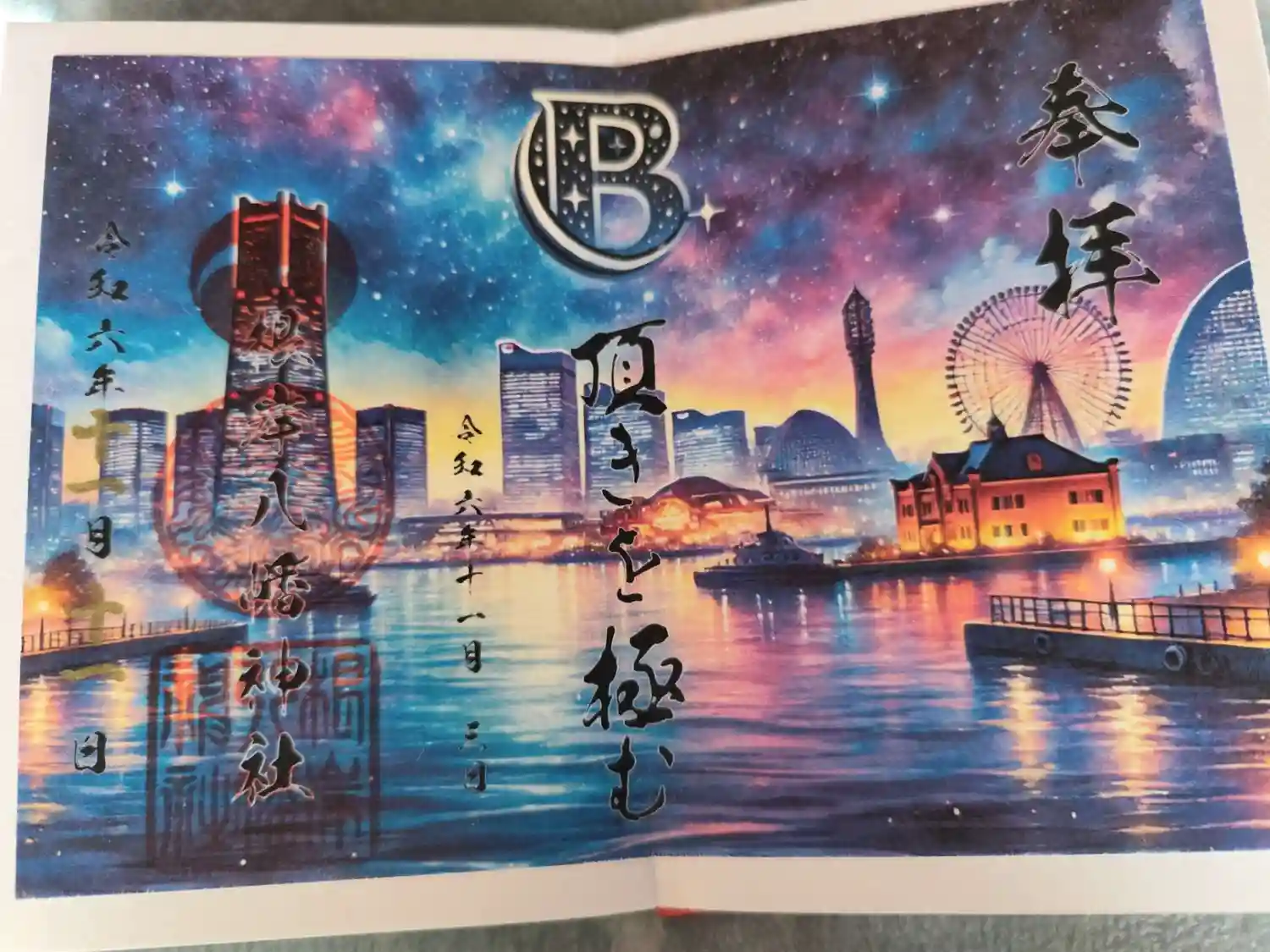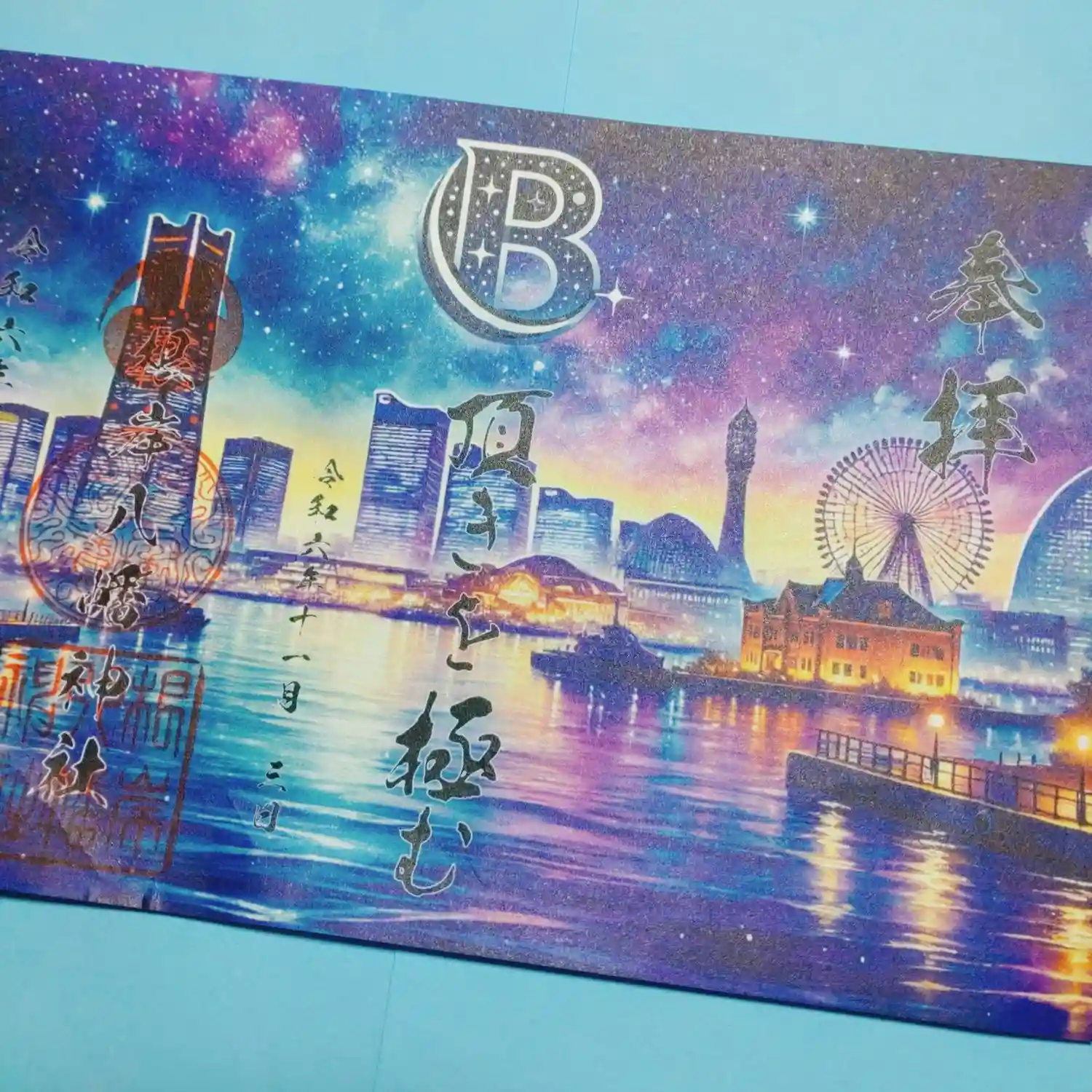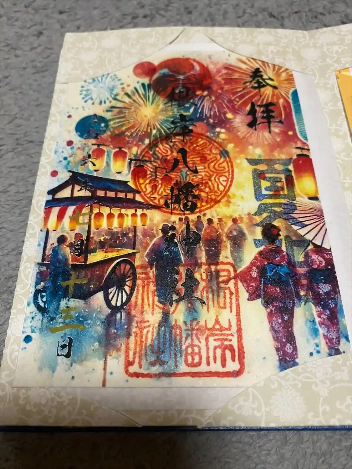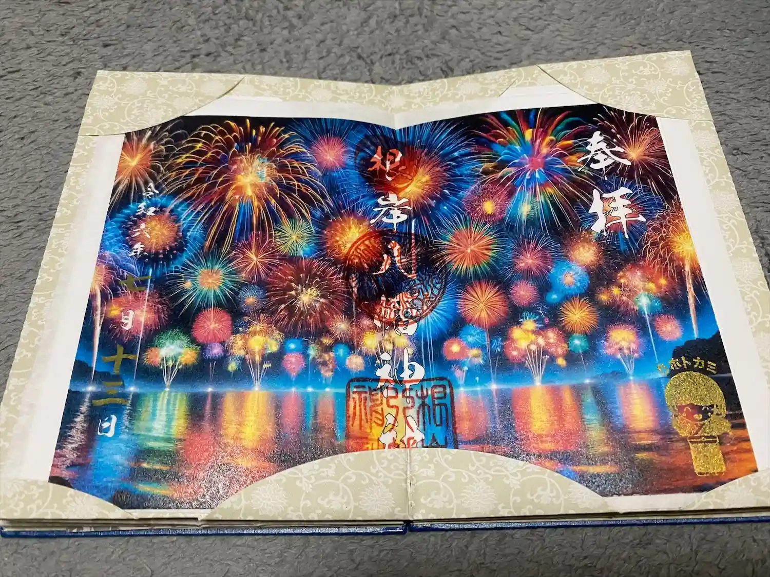 ・7月限定の見開き御朱印です。「夜空に咲く色とりどりの光…