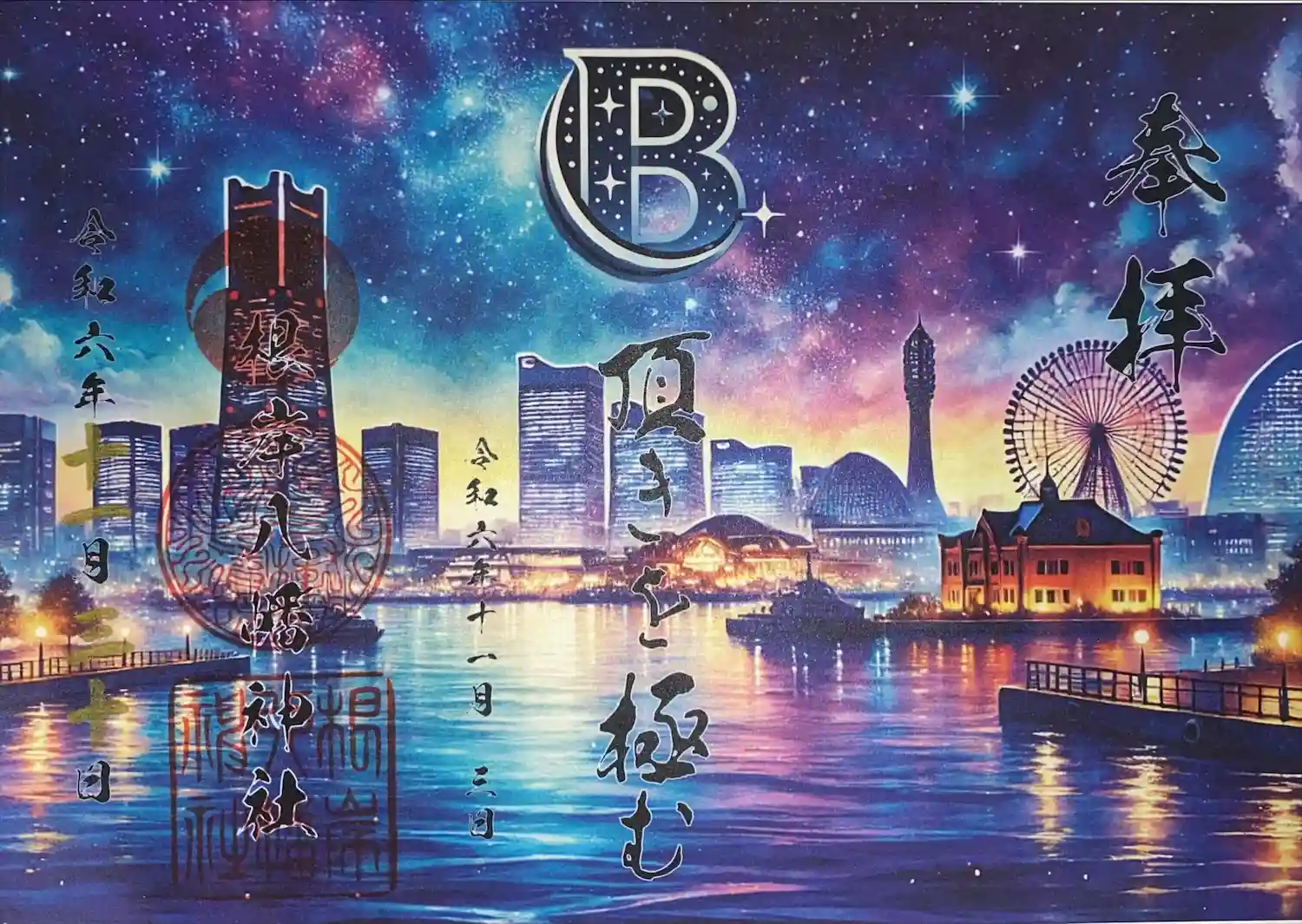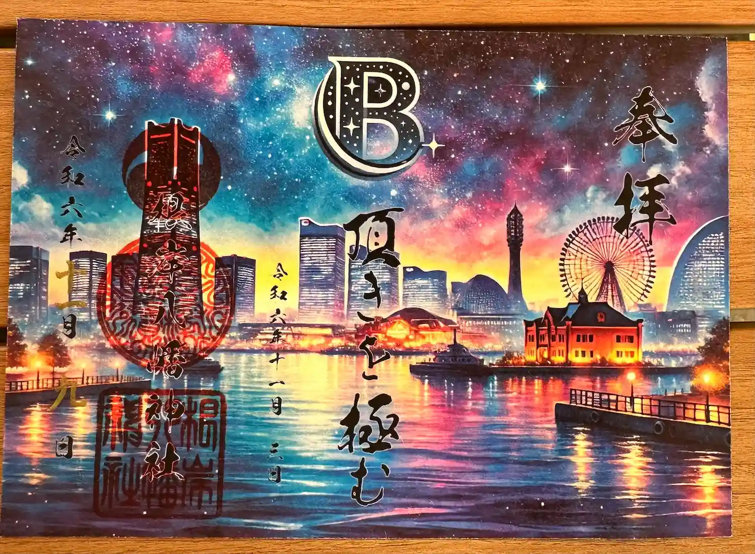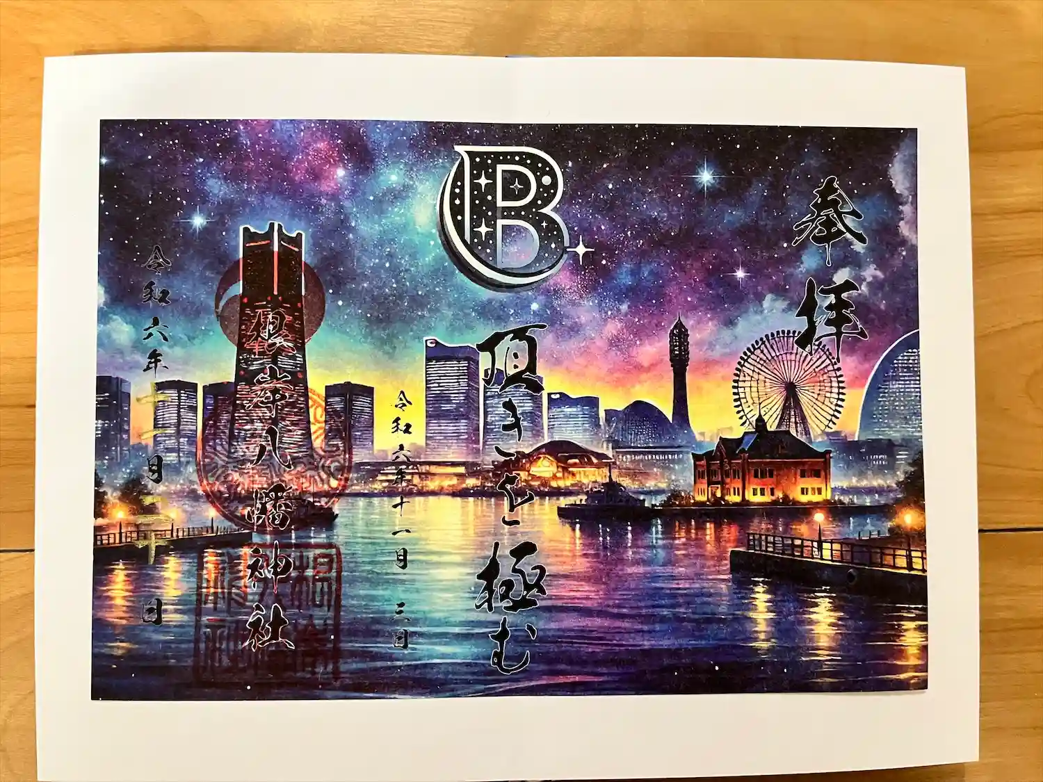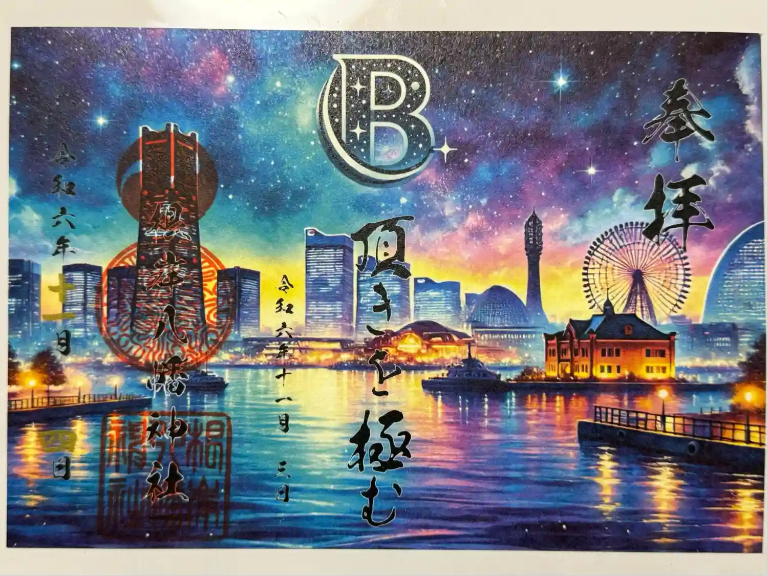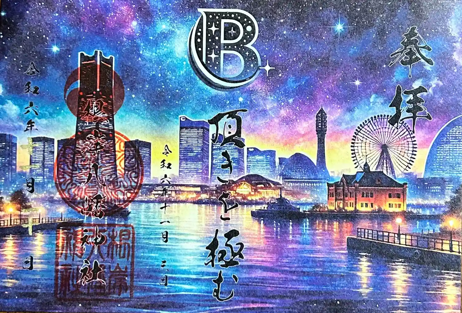 ・7月限定の見開き御朱印です。「夜空に咲く色とりどりの光…