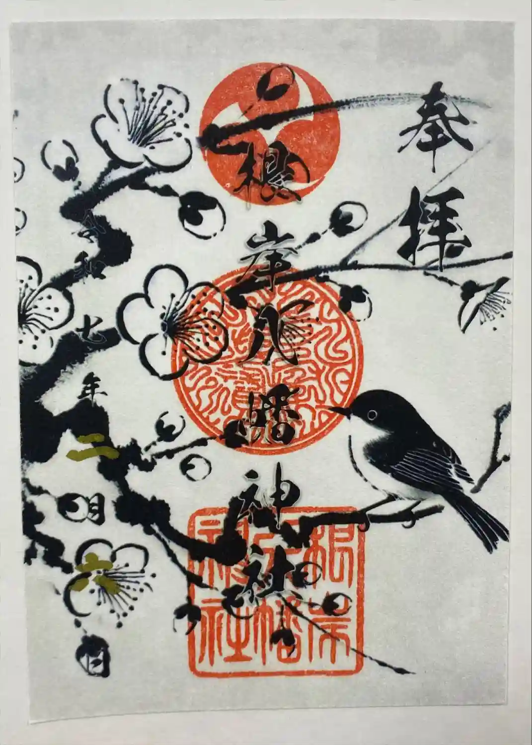 ・2月限定の見開き御朱印【雪梅に遊ぶ目白】