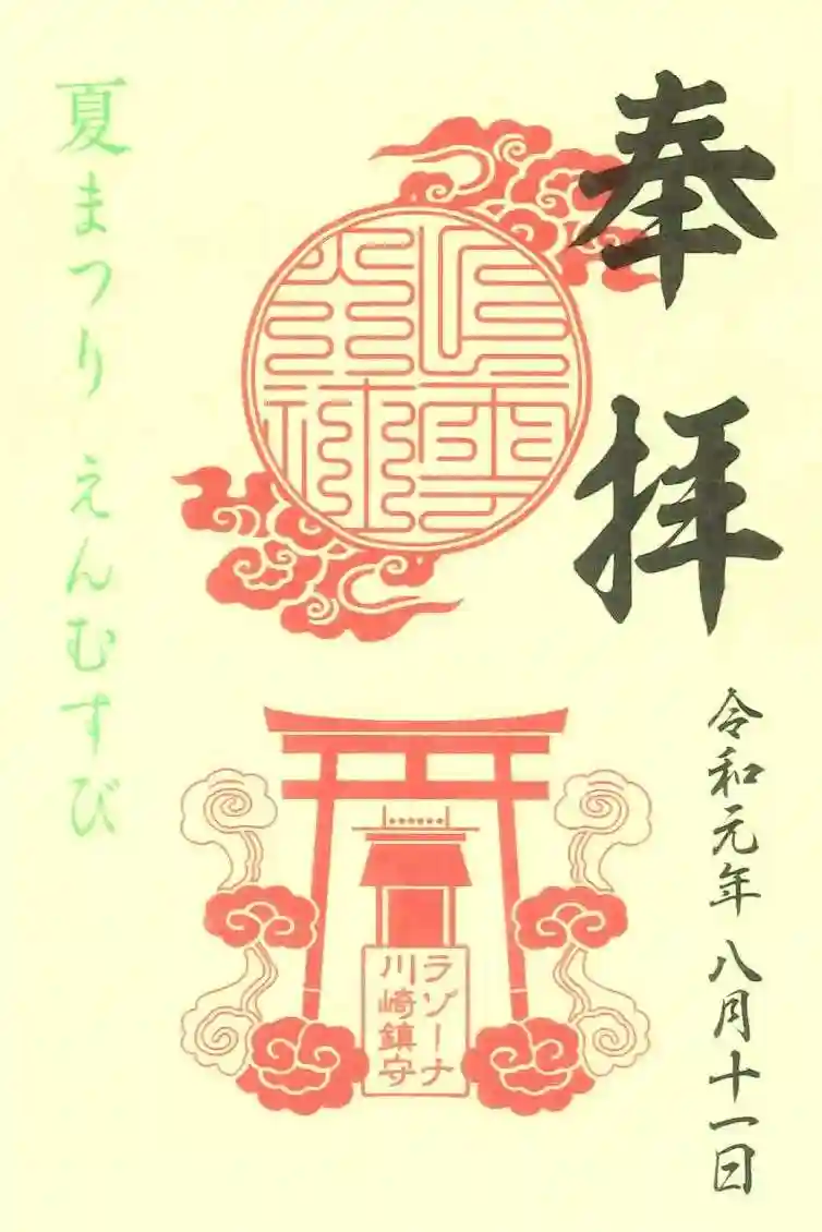 ラゾーナ川崎にある神社です。小さいながらも誇らしでですね。ご朱印は夏まつりの時に頂きました。