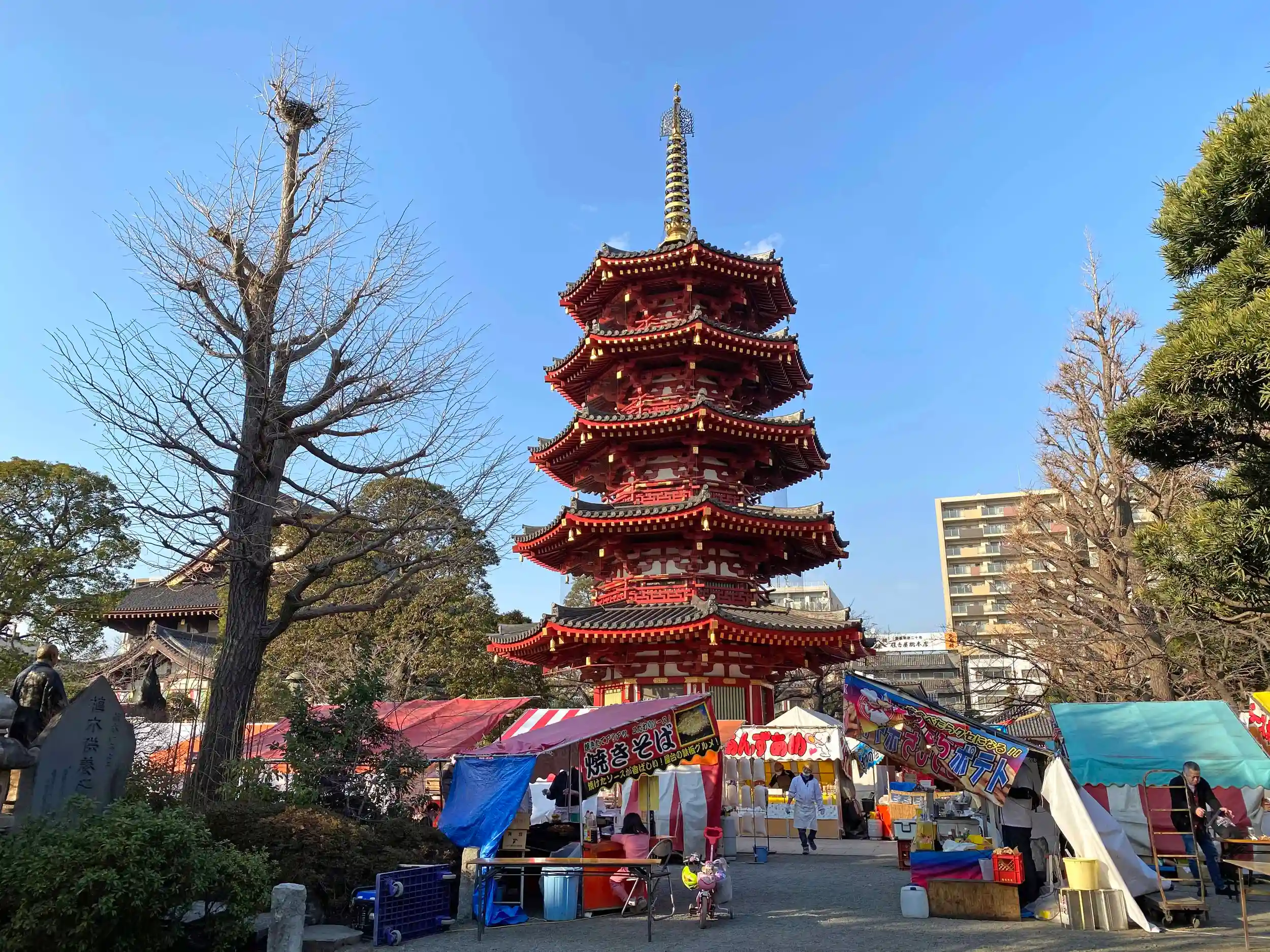 <つるの池>のほとりから見た<八角五重塔>。屋台は不動門から不動堂までの参道沿いに林立。屋台にとっては一等地みたい。