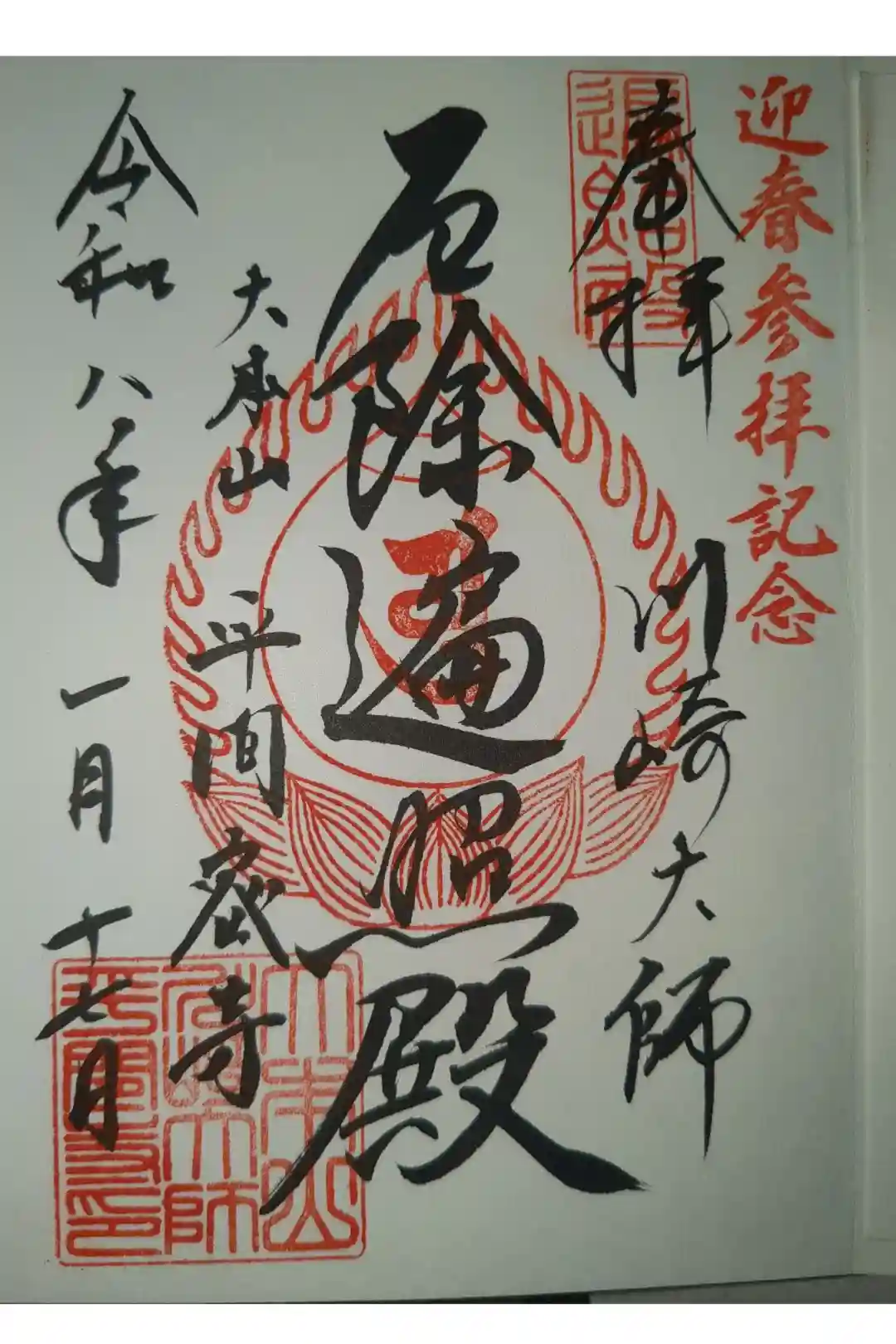真ん中に厄除遍照殿、その右下に川崎大師、左下に大本山平間密寺と書かれ、真ん中に梵字の印、左上に弘法大師諡号壱千百年の印、左下に社印が押されています。