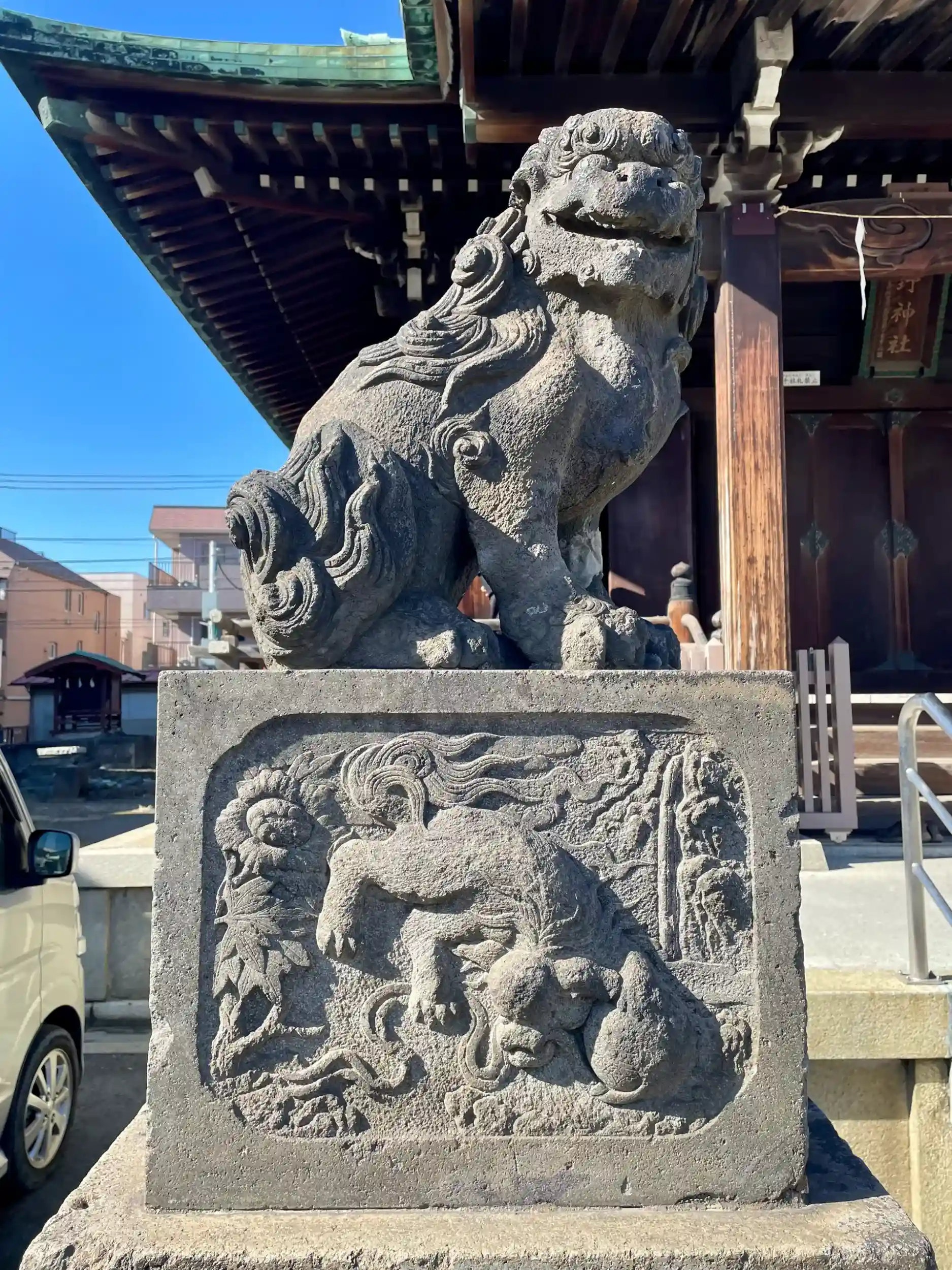 当社には鶴見七福神のひとつである福禄寿が祀られており、また江戸時代の俳人、加舎白雄と大島蓼太が詠んだ句碑がある。