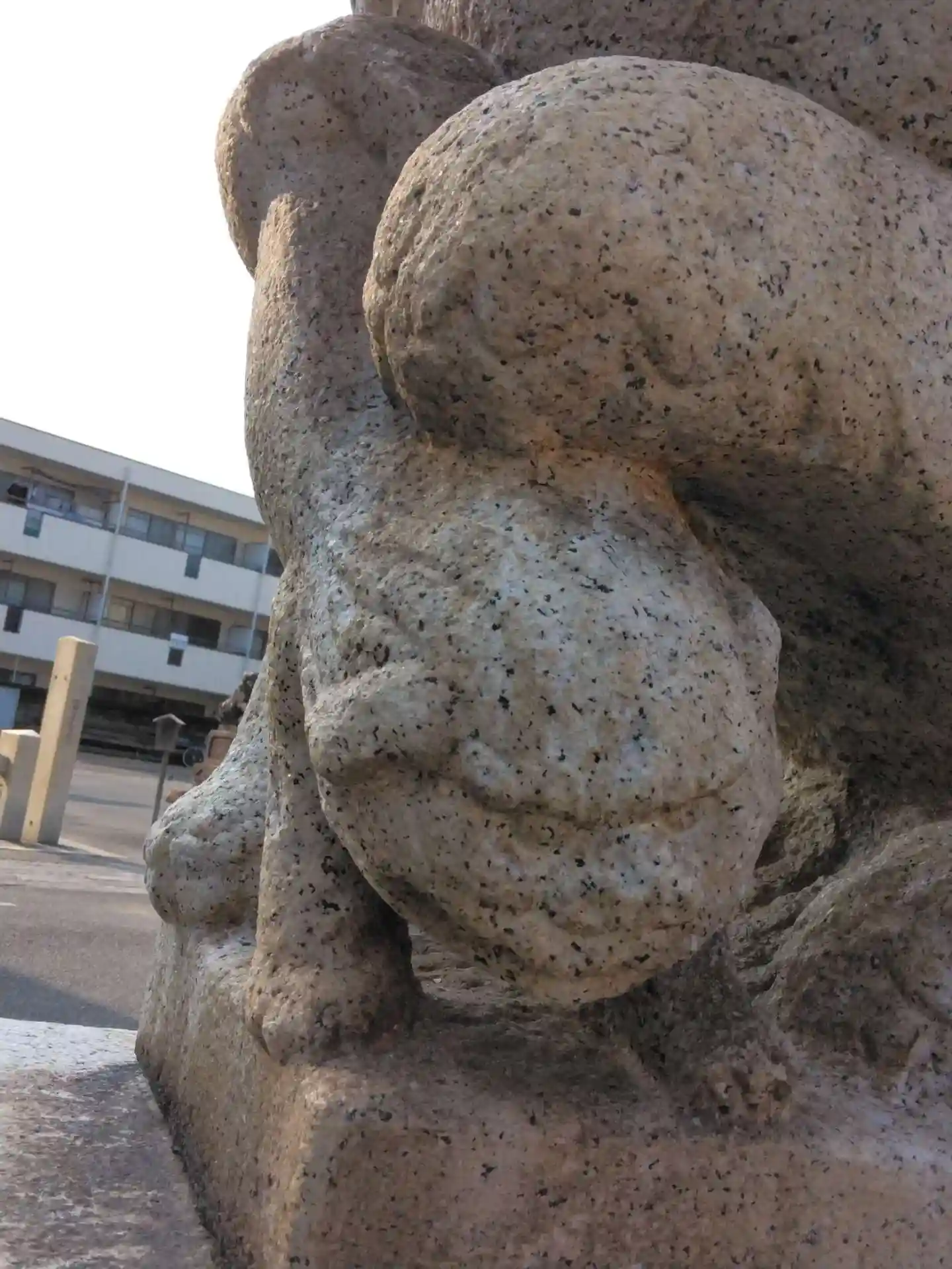 子どもの狛犬さんを抑えている狛犬さんです。