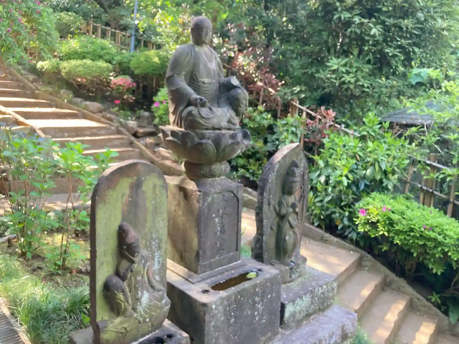 大通りからほんの少し歩いただけなのに、緑豊かな境内は静かで、人の歩いて落ち葉を踏む足音が静かな道。苔の生えた地面や歴史を感じさせる石像は、由緒あるお寺の雰囲気が漂っており神社仏閣好きには人気があります。