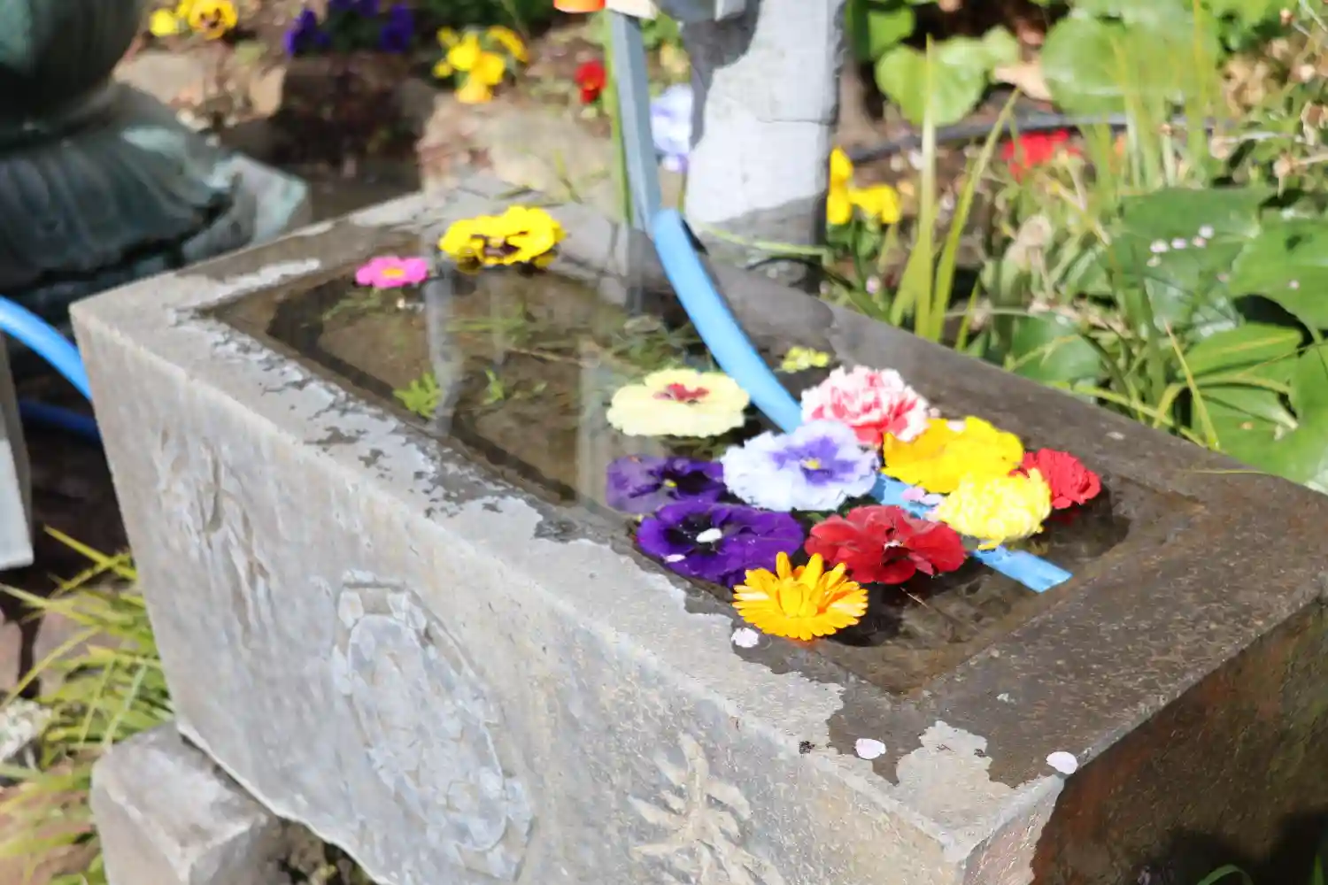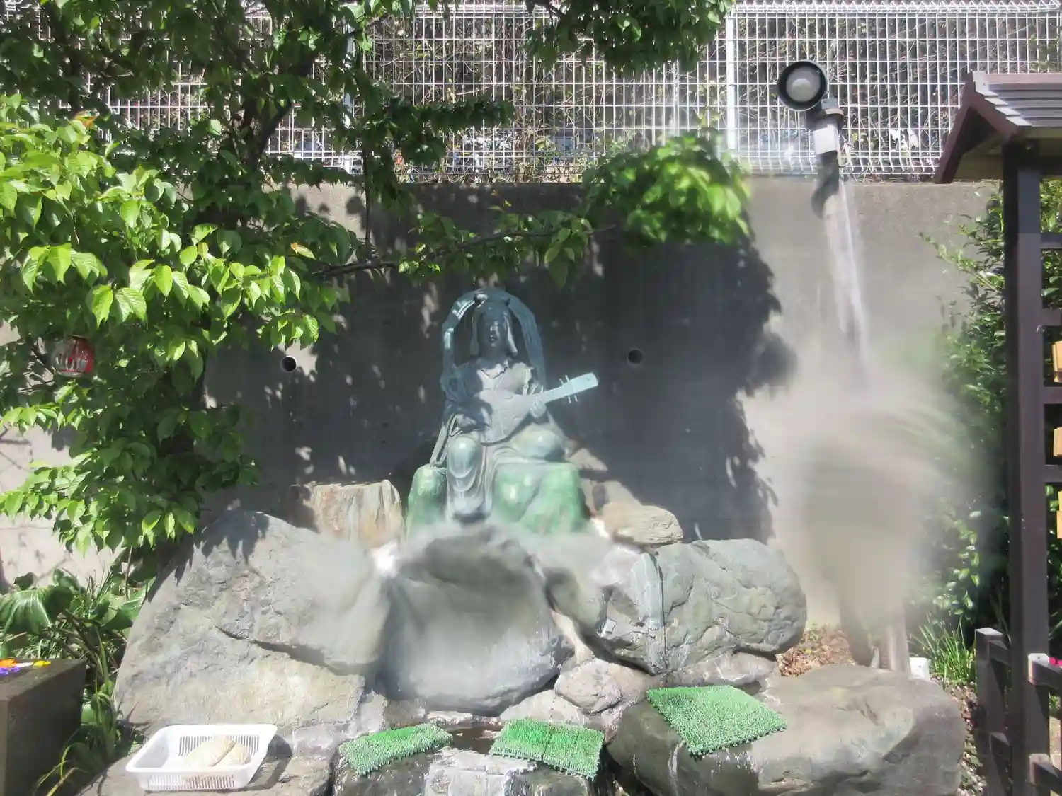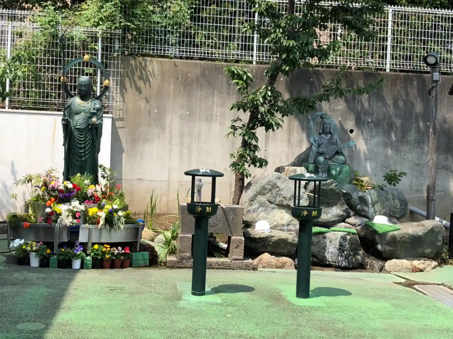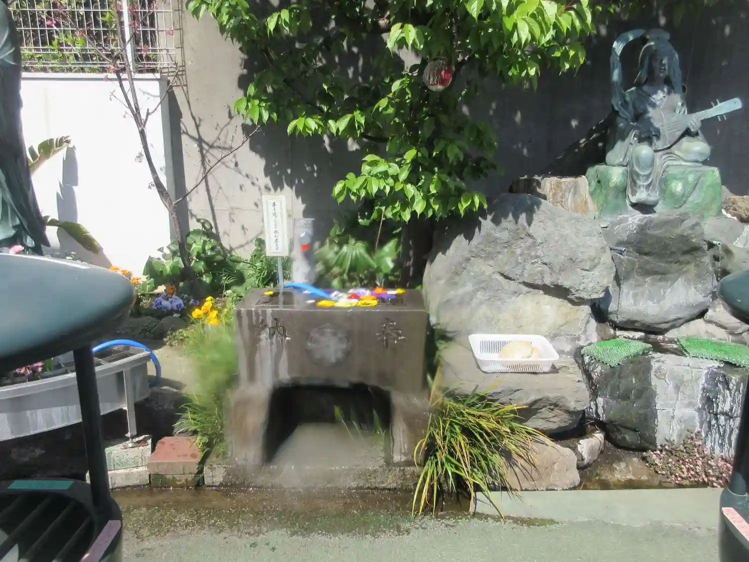 本堂前右手にある、地蔵菩薩(左手)、手水鉢(中央)、弁財天(右手)