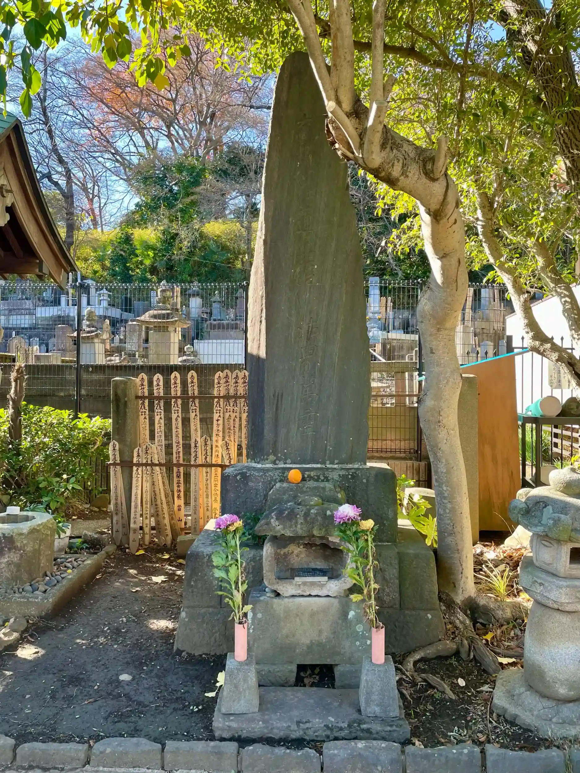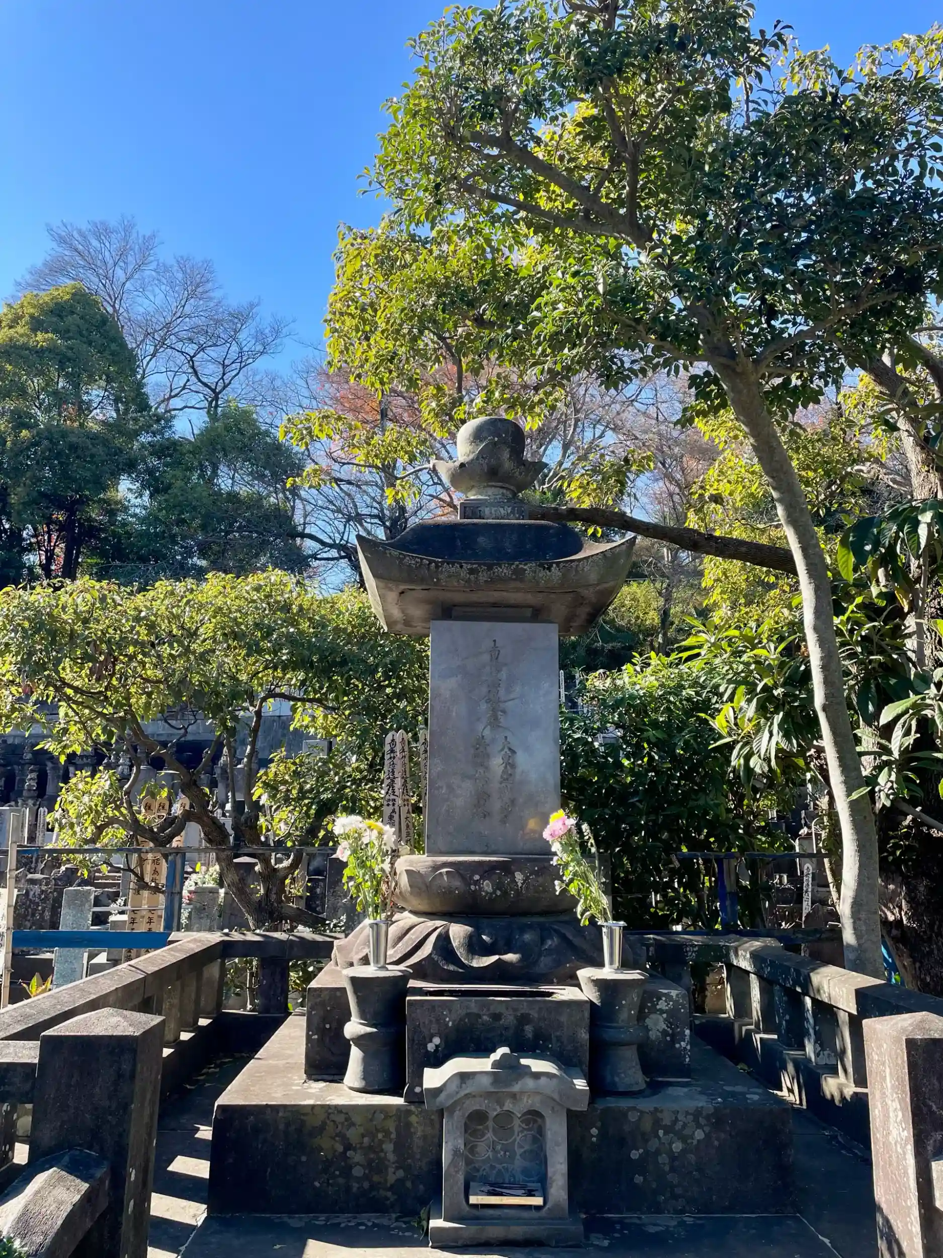 境内には益子焼の陶芸家として人間国宝に認定された濱田庄司の墓がある。